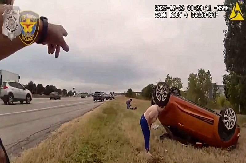 According to the Fort Worth Police Department, Sgt. R. Nichols and Officer E. Bounds responded to a crash at around 9:30 a.m. on Thursday, after reports that a woman and her infant had been involved in a severe accident. The collision caused the vehicle to flip over, ejecting the baby onto the highway. Bodycam video released Friday shows one officer sprinting toward the overturned car as a panicked woman can be heard screaming for her child.