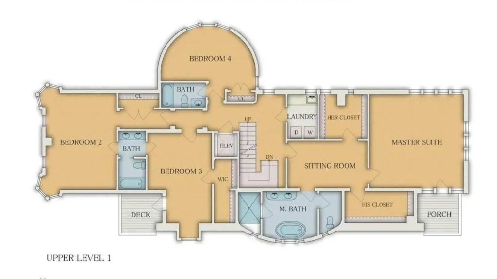 The upper level of this home offers a luxurious and well-organized layout. It features a grand master suite with separate his-and-hers closets, a spa-like master bath, and access to a private porch. A spacious sitting room connects the master suite to the rest of the floor. Three additional bedrooms provide ample space, each with access to a dedicated or shared bathroom. A laundry room adds convenience, while an elevator ensures easy access between floors. A private deck enhances one of the bedrooms, completing this elegant design.