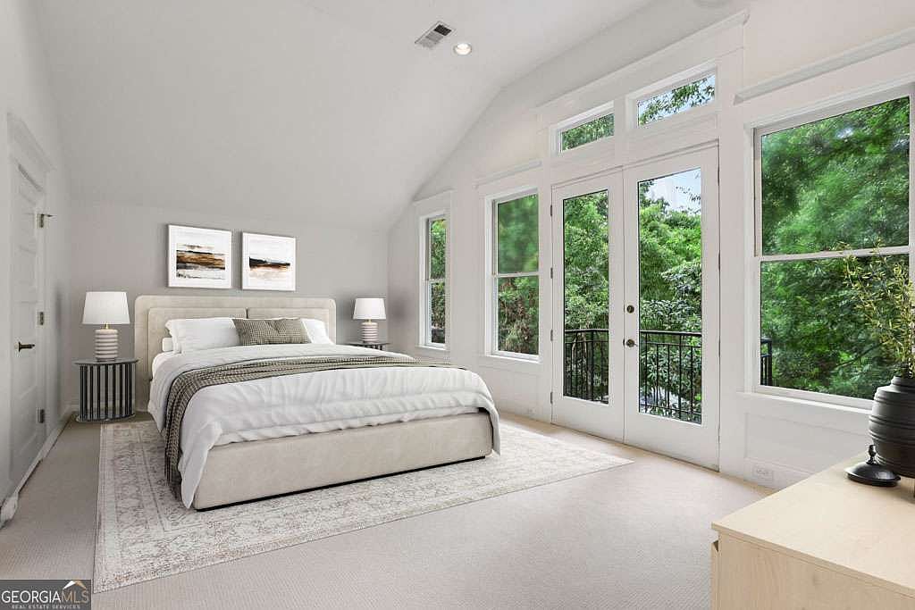 A serene bedroom features a soft neutral palette with plush beige carpeting and walls painted in a clean, crisp white. A king-sized bed with a light upholstered headboard is centered against the back wall, flanked by matching modern lamps set on ribbed bedside tables. Minimalist art hangs above the bed for a subtle accent. Two large French doors and tall windows fill the space with natural light, opening to a small balcony that overlooks lush greenery outside. The room feels spacious and calming, enhanced by high, sloped ceilings and the wide expanse of glass, creating a tranquil retreat.