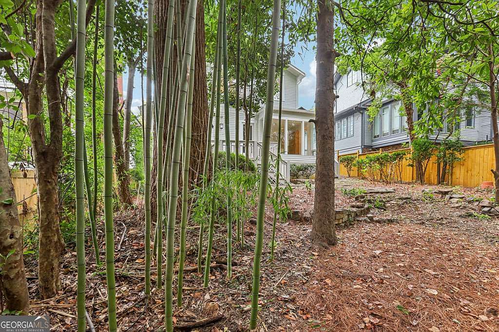 A serene backyard area featuring slender bamboo stalks in the foreground, surrounded by tall, mature trees. The ground is covered with natural mulch and scattered leaves, giving a woodland feel. In the background, there’s a white two-story house with a sunroom or enclosed porch framed by large windows and a set of stairs leading to the garden. A yellow wooden privacy fence lines the right side, where small shrubs and plants border the fence. The space blends wild greenery with some landscaped stone steps leading up a gentle slope towards the home, evoking a peaceful and secluded garden atmosphere.