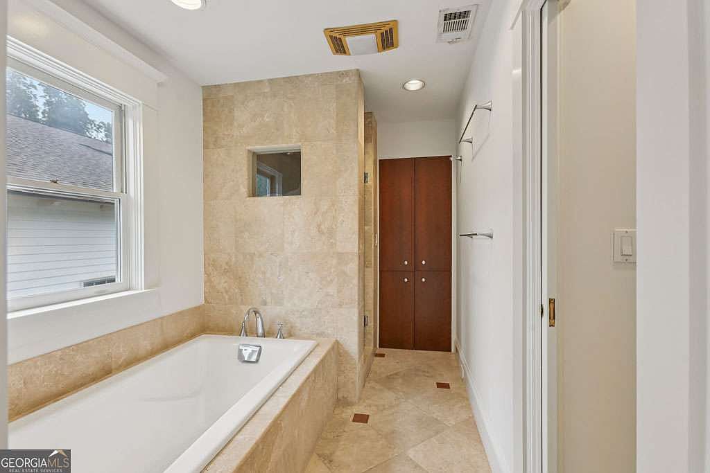 A serene bathroom featuring a deep rectangular soaking tub clad in light beige marble, matching the surrounding floor and wall tiles for a cohesive, spa-like ambiance. A large window beside the tub allows ample natural light to brighten the space, while a small square cutout in the tiled wall adds visual interest. The walls are crisp white, accentuating the clean, modern aesthetic. Towel bars line the right wall, opposite the tub, and sleek built-in dark wood cabinets offer warm contrast and practical storage. Recessed lighting and subtle ceiling vents maintain a minimalist and functional atmosphere.