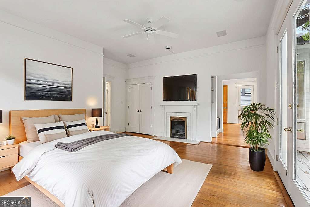 A spacious bedroom with white walls, high ceilings, and a large windowed door letting in natural light. The bed features a light wooden frame and white bedding with beige and black accent pillows, flanked by matching nightstands each with a lamp. Above the bed hangs a framed landscape painting in muted tones. Across from the bed is a white fireplace topped by a flat-screen TV, adding a modern touch to classic architectural detailing. A large potted plant sits near French doors that open to the outside. The hardwood floor brings warmth to the otherwise airy, minimal aesthetic.
