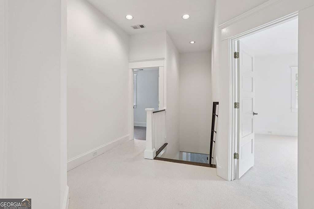 A bright, airy hallway leads to a staircase landing, with recessed lighting creating a soft, even glow throughout the space. White walls, trim, and carpeted floors emphasize a clean, minimalist aesthetic, while the open door reveals an adjoining bedroom continuing the same color scheme. The simple wooden stair railing and subtle architectural details, such as thick door casings and rectangular panels on the door, evoke classic styling. Natural light from windows in the adjacent rooms blends with overhead lighting, giving an inviting, open feel to the upper level of the home.