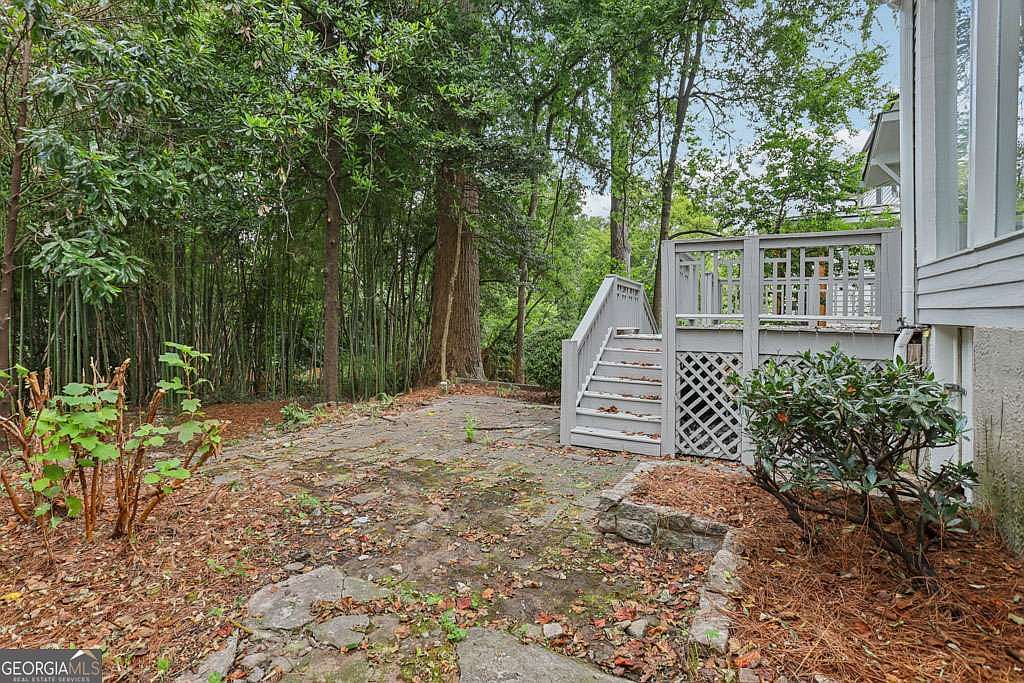 A cozy stone patio sits at the back of the house, framed by lush greenery and mature trees that provide abundant shade and privacy. The deck, painted a soft gray, features classic white railing and latticework beneath, enhancing its cottage charm. Steps connect the elevated deck to the natural stone path, making the transition between outdoor living spaces seamless. Pine straw mulch borders the area, with shrubbery and native plants adding texture and color. The serene palette of grays, greens, and wood tones creates a peaceful, inviting outdoor space perfect for relaxation or entertaining.