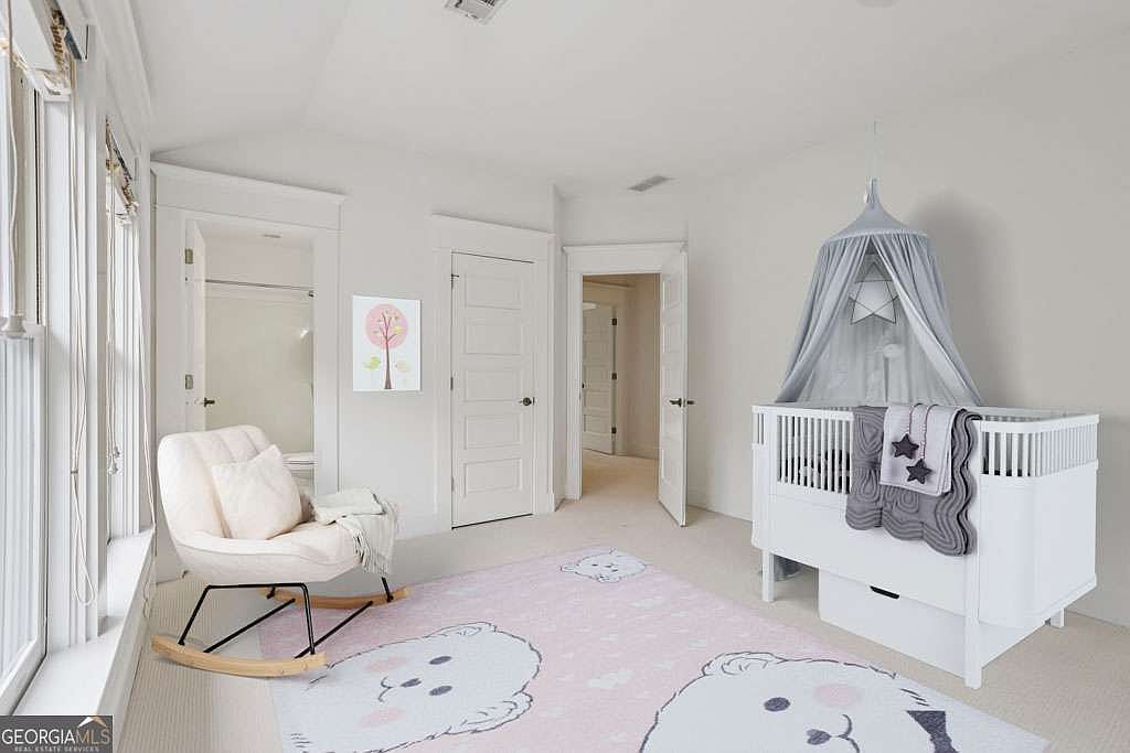 A spacious and airy nursery features soft, neutral tones with plenty of natural light streaming in from tall windows along one wall. The white crib, adorned with grey and lavender textiles and a whimsical canopy, creates a cozy sleeping space for a baby. A plush rocking chair sits on a pale pink area rug decorated with playful bear faces, enhancing the gentle ambiance of the room. The walls and trim are painted in crisp white, and simple decor, like framed children’s art, adds a touch of warmth. Multiple doors lead to a closet and an adjoining bathroom, reflecting a functional layout.