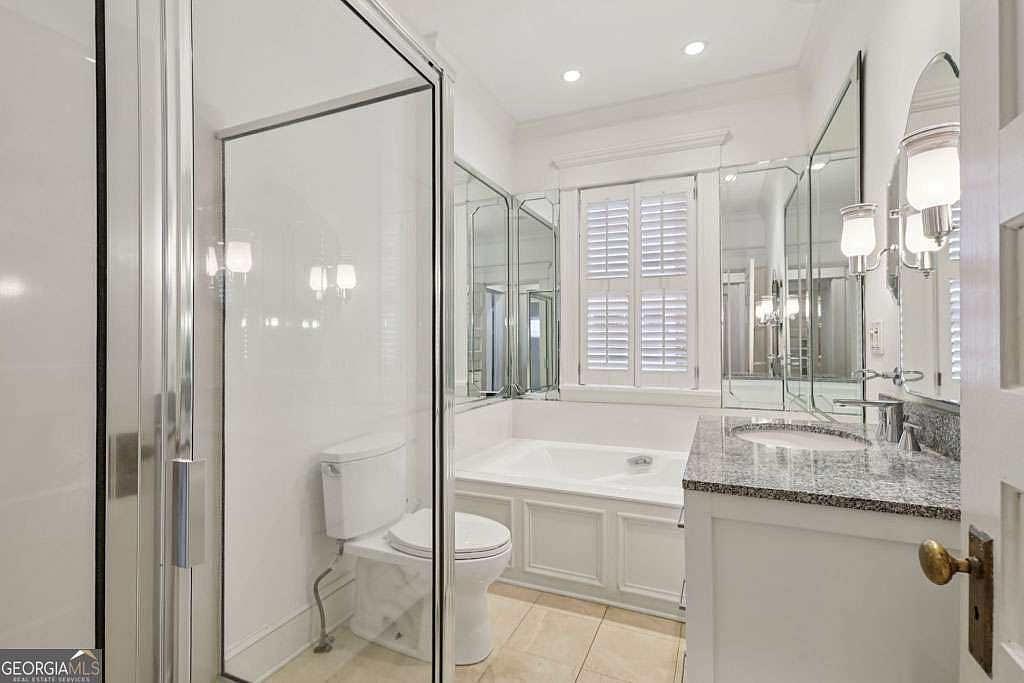 Bright and spacious bathroom featuring a combination of white and light neutral tones. A glass-enclosed shower sits to the left, while a built-in soaking tub stretches beneath a large window with plantation shutters. The right side holds a vanity with granite countertop, under-mount sink, and ample storage. Elegant mirrored walls above the vanity and on the adjacent wall amplify light and create a sense of expansiveness. Modern wall-mounted sconces with white shades provide warm illumination. The flooring is covered in large, glossy cream tiles, contributing to the clean and sophisticated ambiance of the room.