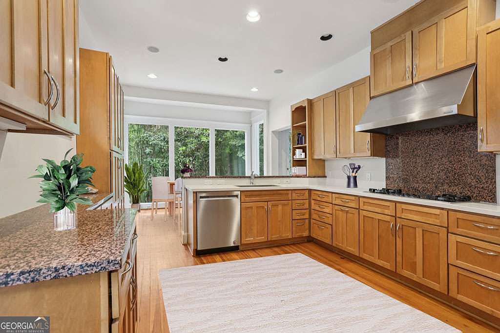 An expansive kitchen features honey-toned wooden cabinets lining two walls, topped with sleek granite counters. A modern stainless steel vent hood hangs above a gas cooktop. Neutral countertops add to the bright appearance, complemented by a light wood floor and a large cream area rug. Natural light pours in through floor-to-ceiling windows at the far end, offering a view of leafy green gardens and illuminating a cozy breakfast nook with a dining table and chairs. Pops of green from decorative plants soften the space, while recessed lighting keeps the ambiance open and contemporary.