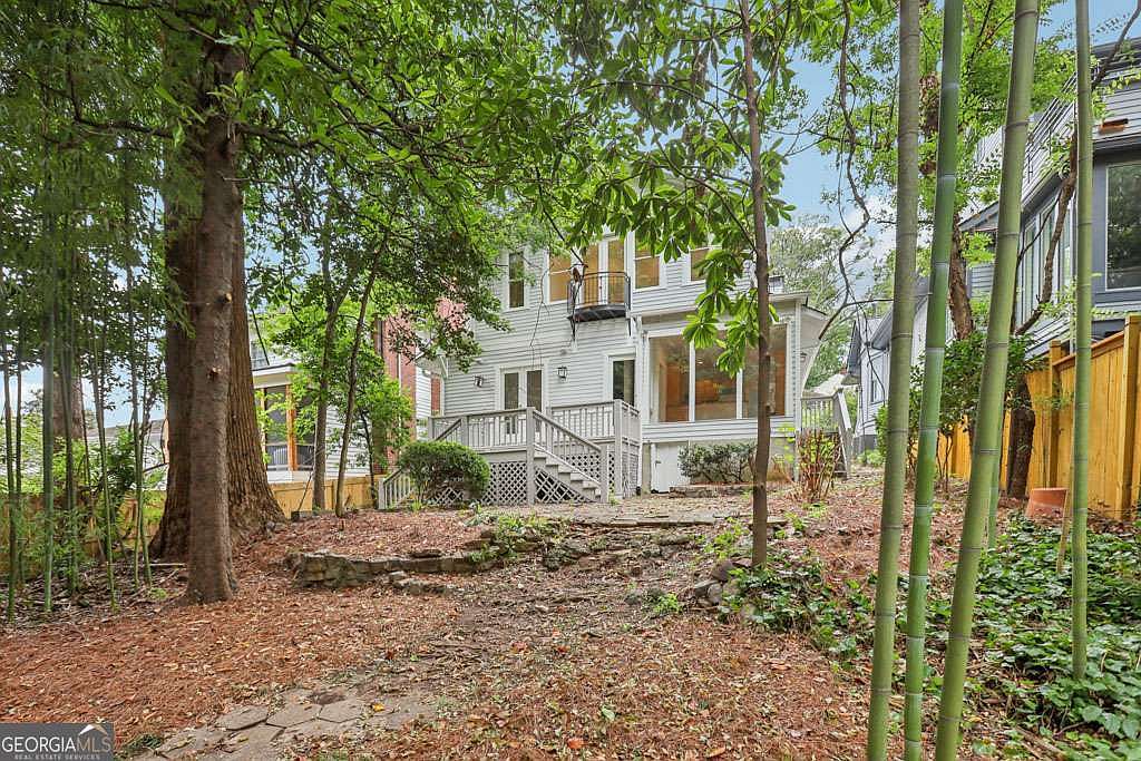 A secluded backyard is framed by mature green trees and tall bamboo, creating a natural, shaded retreat. The ground is covered with pine straw and scattered leaves, with a rustic stone pathway leading up to a small landing and porch at the house’s rear entrance. The home features white siding, numerous large windows, and a screened-in porch, allowing ample light while maintaining privacy. Tall wooden fences on either side add to the sense of seclusion, while the surrounding plantings and greenery contribute to a peaceful, inviting outdoor atmosphere typical of a historic American home.