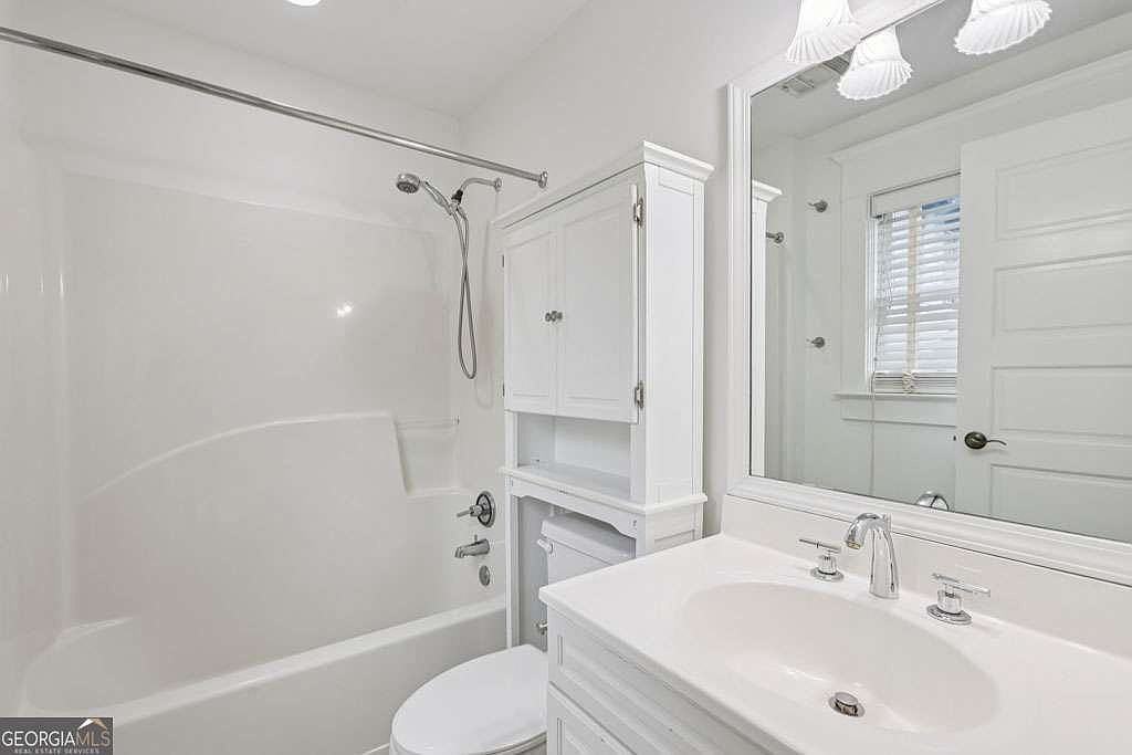 Compact, bright bathroom featuring a sleek white vanity with a built-in sink and chrome faucet. A large, framed mirror above the sink reflects abundant natural light from the nearby window. The cabinetry beside the toilet provides additional storage, matching the crisp white color scheme. The shower-tub combination sits opposite the vanity and is fitted with a simple chrome showerhead and fixtures. Classic paneled doors and trim add subtle architectural detail. The overall look is clean, minimal, and timeless with white dominating the palette, giving the space a fresh and airy ambiance.