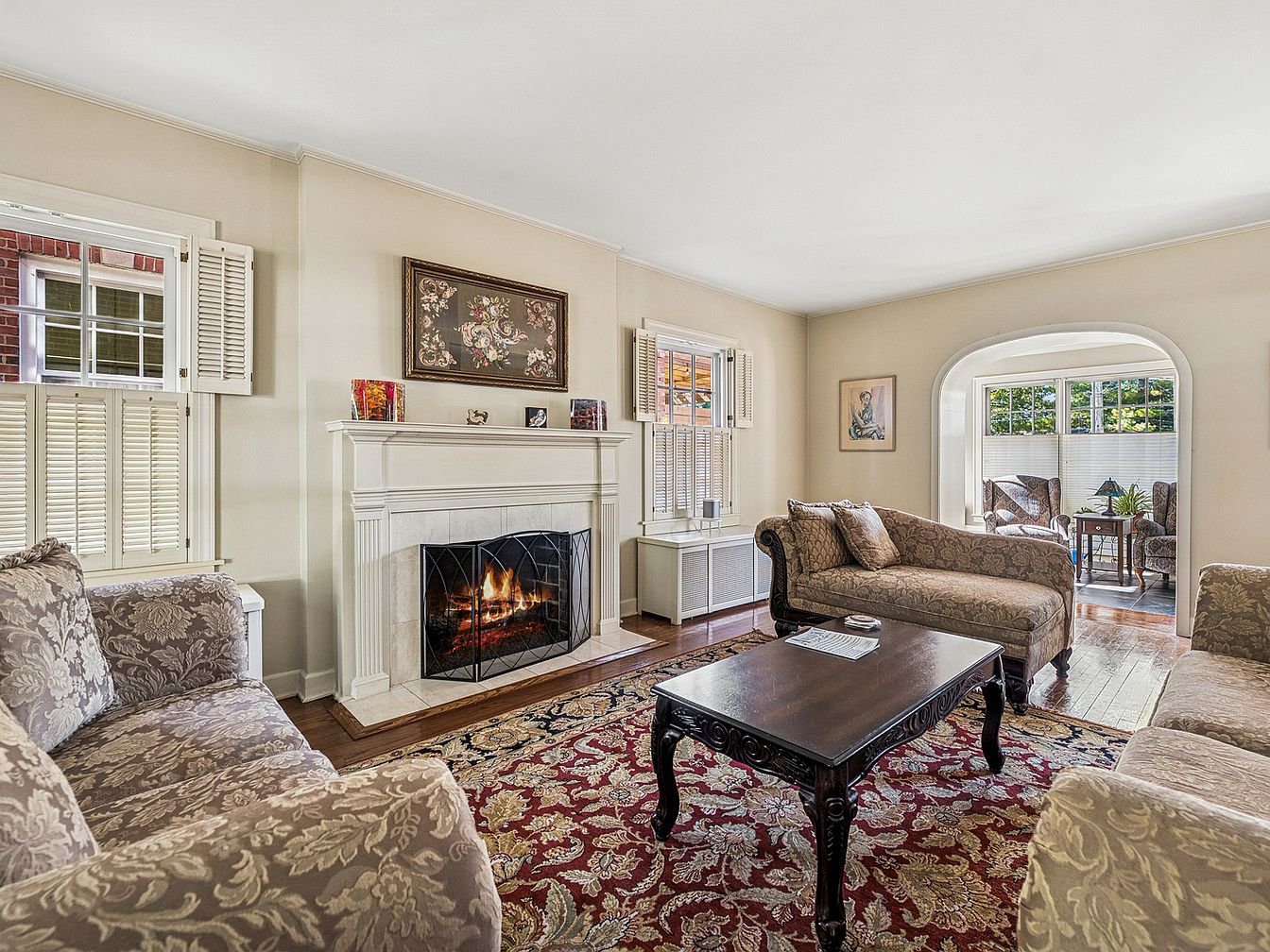 A spacious living room features soft beige walls and a large white fireplace as its centerpiece, topped with a floral still life painting. Patterned upholstered sofas and a matching chaise longue provide comfortable seating around a dark wood coffee table placed atop a richly patterned oriental rug in deep reds and golds. Sunlight streams through wide windows with white plantation shutters, enhancing the room’s brightness. An elegant archway leads into a sunny sitting alcove with windows wrapping around the small space, where two armchairs and a side table invite relaxation. Hardwood floors and classic crown molding complete the traditional, cozy feel.