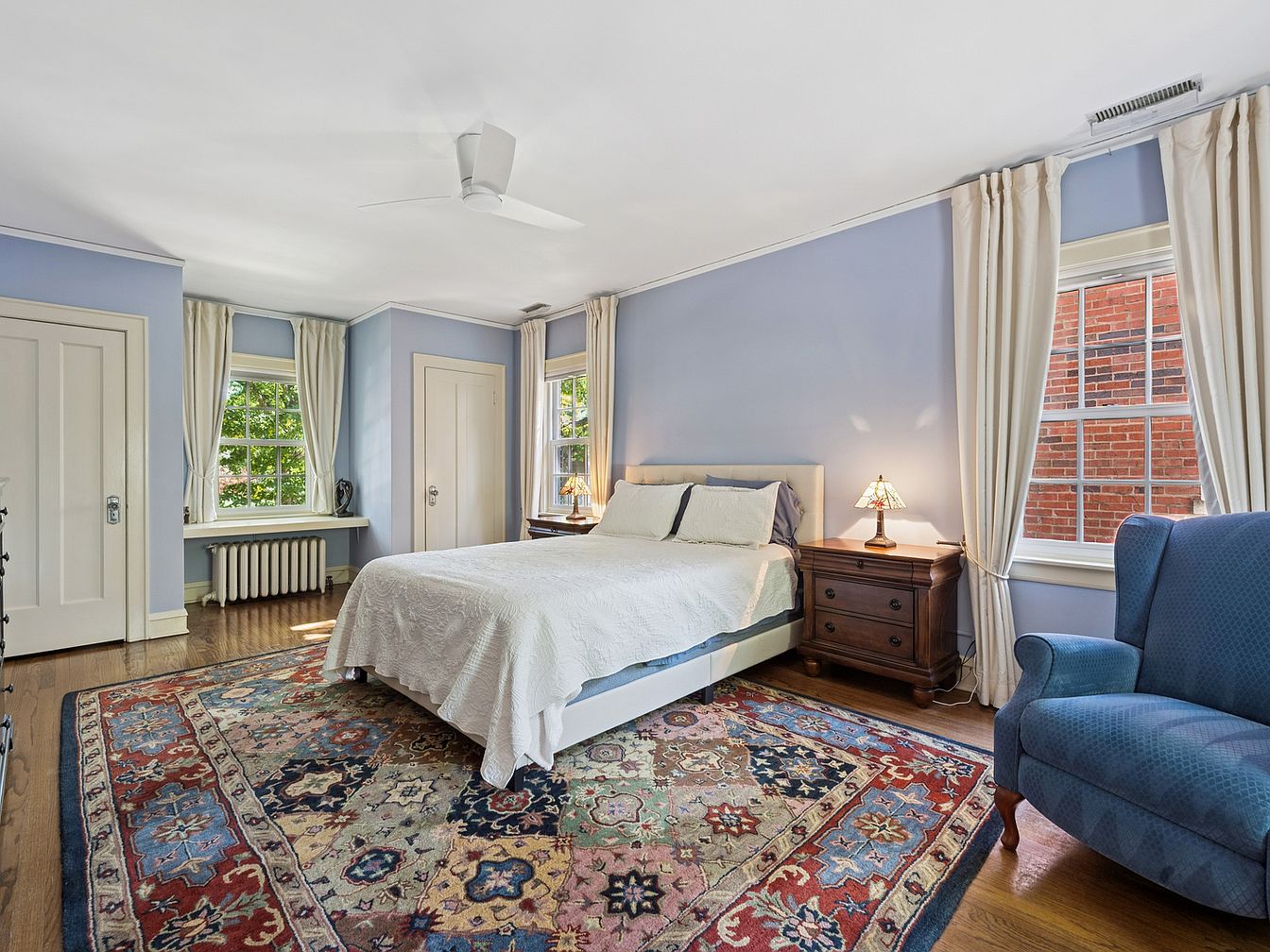 A spacious bedroom with soft lavender-blue walls, high white ceilings, and polished hardwood floors. A large area rug with intricate, multicolored patterns grounds the space, adding warmth and personality. The bed, centrally positioned, features a white coverlet and neutral pillows. On either side of the bed, classic dark wood nightstands support vintage-style lamps with stained-glass shades. Two large windows allow ample daylight, dressed in elegant cream drapes that frame views of brick and greenery outside. An upholstered blue armchair sits in the corner, while a simple desk under one window and traditional radiator provide functional, historic charm.