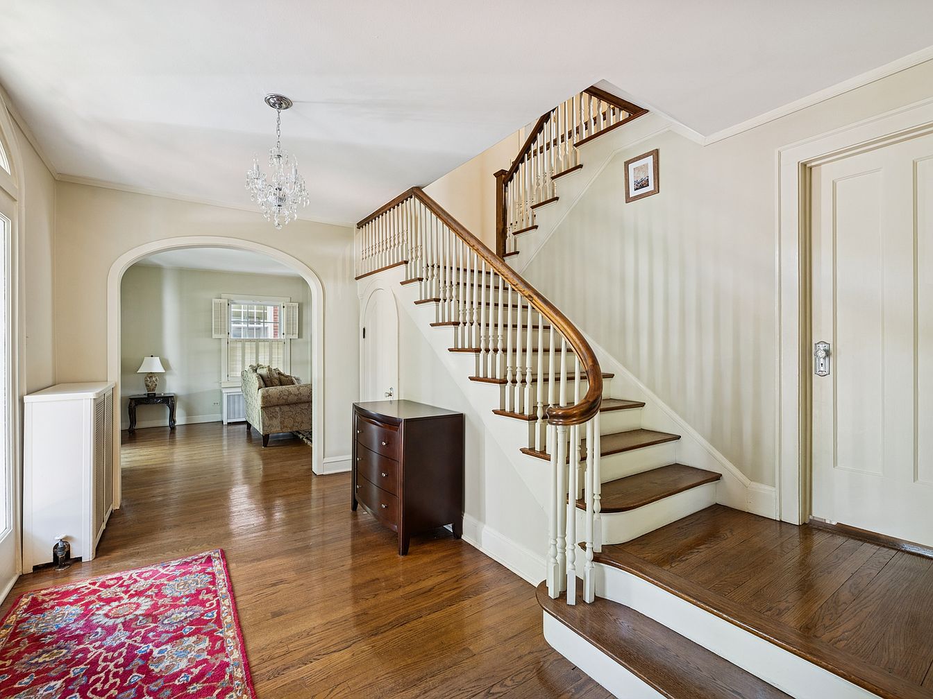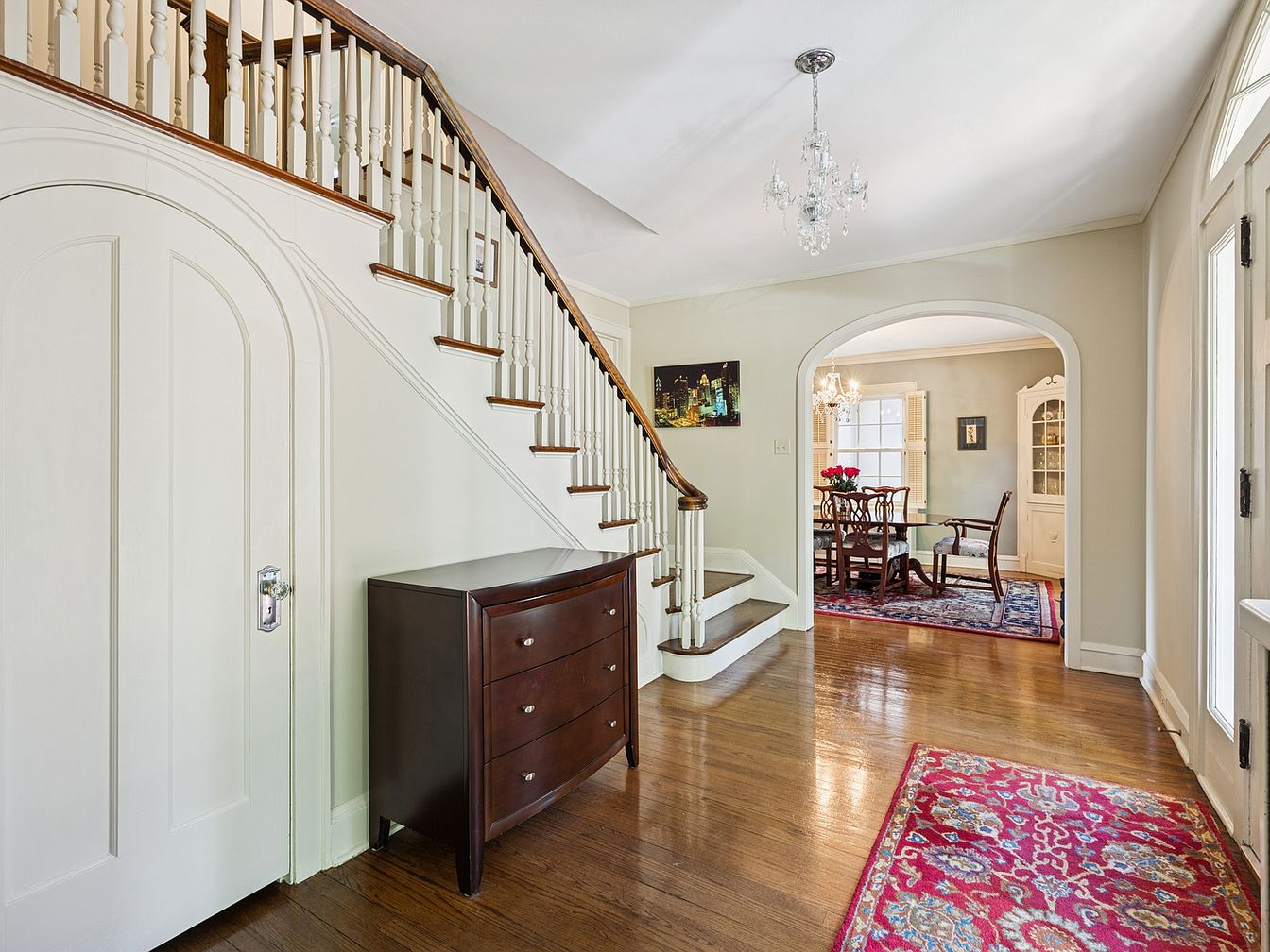 Entryway with warm wooden floors leading to a staircase with white spindles and a dark wooden railing. To the left, an arched door sits beneath the stairs, painted in a light cream color. A dark wood, three-drawer chest stands beside the staircase. A crystal chandelier hangs from the ceiling, adding elegance. Through an arched opening, the formal dining room is visible, with a glass table, classic wooden chairs, and a corner cabinet. A colorful red area rug lies in front of the door, providing contrast to the neutral wall tones and contributing to the room’s historic, refined, and inviting character.