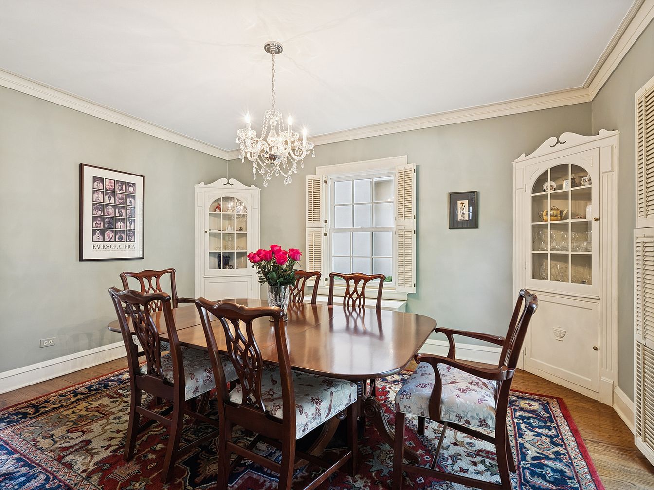 A spacious, traditional dining room features a polished wood table with six matching carved chairs that have floral-patterned upholstery. The walls are painted a soft sage green, complemented by creamy white trim and crown molding. Two built-in corner cabinets with glass doors display crystal and porcelain pieces, adding a touch of classic elegance. In the center, a sparkling crystal chandelier hangs above a vase of pink roses, creating a focal point. The floor is covered with a richly colored, intricate Persian-style rug that adds warmth and sophistication. Shuttered windows allow soft natural light into the serene, harmonious space.