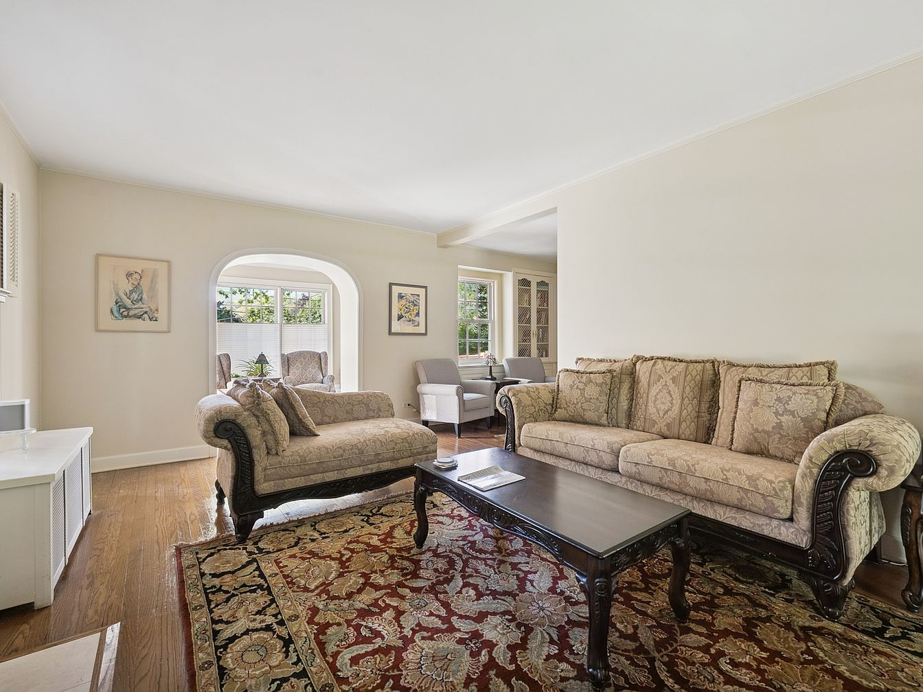 Spacious living room with hardwood floors and light cream walls, creating an airy and welcoming atmosphere. Two ornate, patterned sofas with carved wooden arms and legs face a dark wood coffee table set atop a rich red and gold floral rug. An arched doorway leads to a cozy sunroom, where armchairs bask in natural light from large windows with garden views. Framed artwork hangs on the walls, while a built-in bookcase in the adjacent space and classic radiators add historic charm. Overall, the room combines traditional elegance with comfort and plenty of natural sunlight.
