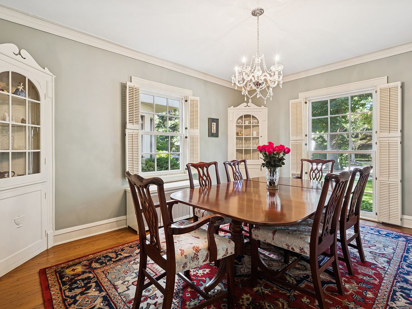 A formal dining room features a polished wooden table with eight intricately carved chairs upholstered in patterned fabric. The space is warmed by a large, colorful oriental rug covering a wood floor. Elegant white built-in corner cabinets display delicate glassware and figurines, adding a touch of heritage charm. Two large windows framed by classic white shutters allow abundant natural light to pour in, illuminating the pale gray walls. Centered above the table, a sparkling crystal chandelier adds a sense of refinement and classic glamour. A vase of fresh red roses serves as a vibrant centerpiece, enhancing the welcoming ambiance.