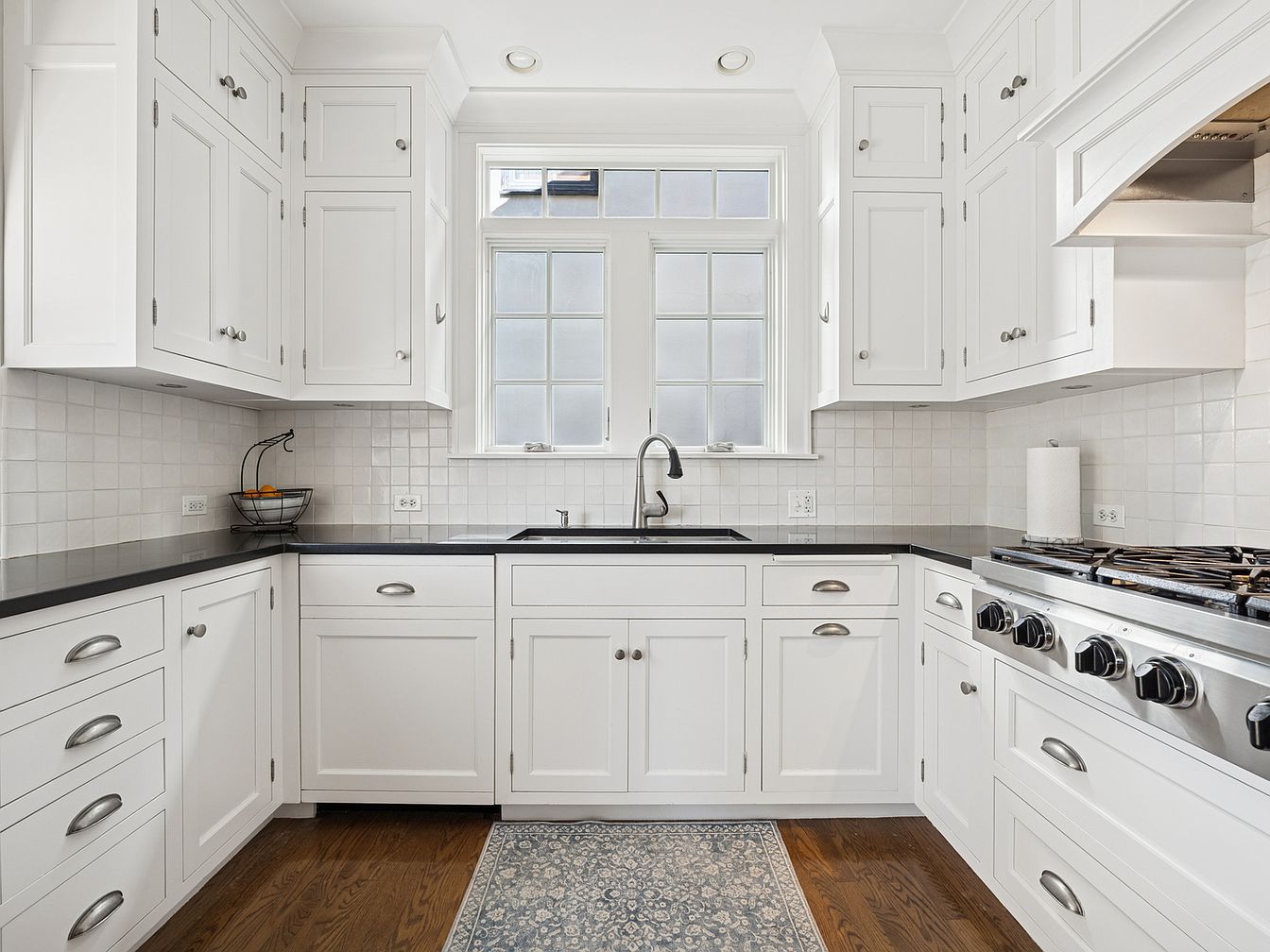 Bright and airy kitchen with white cabinetry arranged in a U-shape, accented by brushed nickel hardware. A large window above a single-basin black sink lets in natural light, framed by subway-style square tile backsplash in glossy white. Black quartz countertops create a striking contrast with the cabinets and complement the modern stainless steel stove and range to the side. The floor is medium-toned wood, adding warmth, and a flexible hose faucet sits at the center. A delicate patterned rug in muted blue and cream rests in front of the sink, adding subtle color and softness to the space.