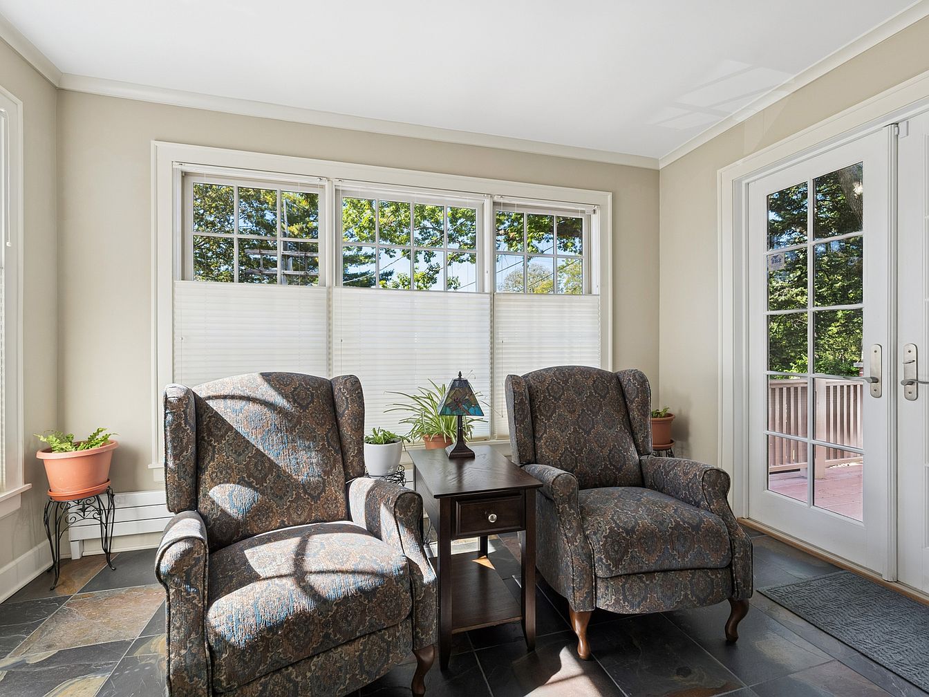 A cozy sunroom filled with natural light, featuring two matching upholstered armchairs in a blue and brown patterned fabric. The chairs are positioned side by side around a dark wood table, which holds a stained glass lamp and a few small potted plants, adding warmth and character to the setting. Light beige walls and a slate tile floor create a neutral and calming backdrop. Several large windows and French doors fill the space with daylight and offer views of greenery outside, while pale blinds provide privacy and diffuse the sunlight. Small potted plants rest on decorative stands in the corners.