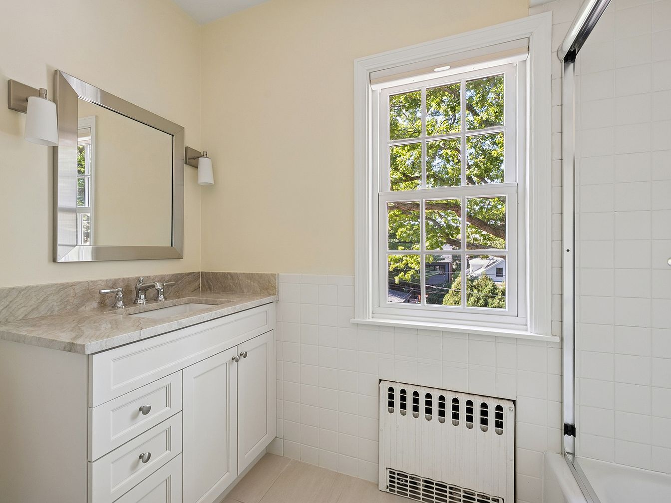 A compact, bright bathroom features a white wood vanity with shaker cabinets, accented by sleek silver knobs. The countertop is a beige marble with subtle veining, matching the modern, rectangular mirror framed in silver above. Twin minimalist sconces flank the mirror, providing soft lighting. Walls are painted a gentle cream, meeting classic white tile that covers the lower half of the room and continues into the tub and shower area. A large, multi-paned window lets in abundant natural light and frames green trees outdoors. Clean lines and a neutral palette create a fresh, inviting feel. A white radiator is situated beneath the window.