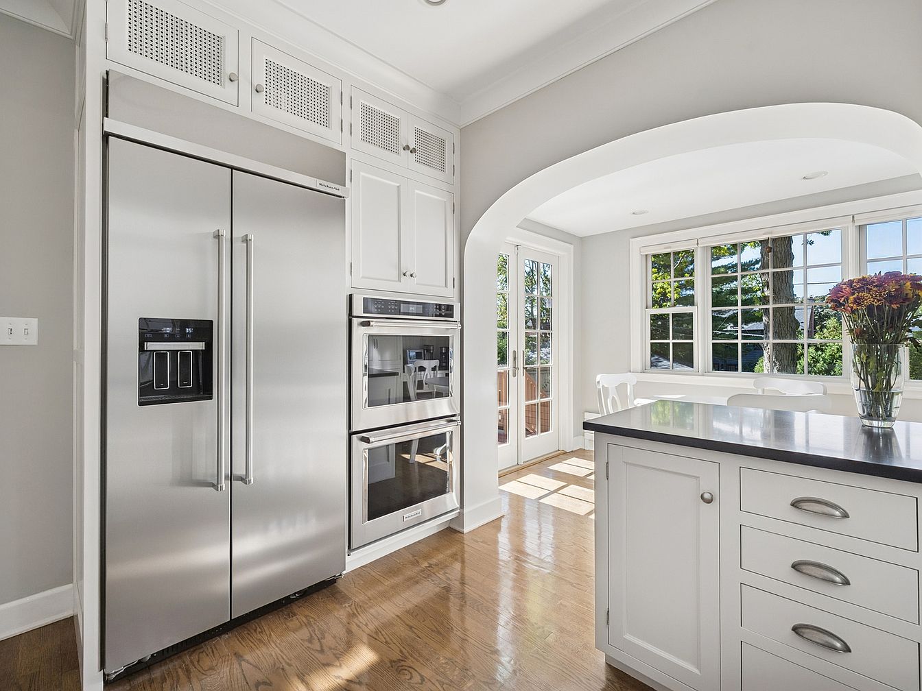 This kitchen area features gleaming hardwood floors, white shaker cabinetry, and modern stainless-steel appliances, including a double oven and a side-by-side refrigerator. An airy, arched opening leads to a breakfast nook bathed in natural light from large windows overlooking greenery. The counters are dark stone, providing contrast against the crisp white cabinetry. Brushed metal handles add a sleek touch. A simple glass vase with fresh flowers brings color to the otherwise neutral palette. The French doors open onto an outdoor space, creating a seamless indoor-outdoor connection and ensuring this dining corner feels cheerful and inviting.