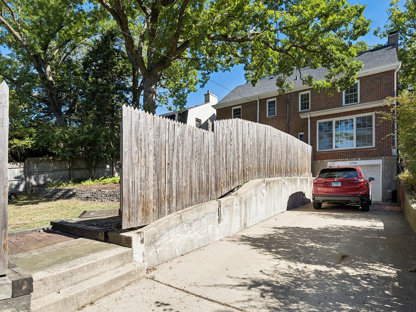 Concrete driveway leads up to a brick garage attached to a stately two-story home. The driveway is bordered by a tall, weathered wooden fence with a gate, which opens to a garden area featuring a low stone retaining wall on the left. Large leafy trees provide ample shade and cast dappled shadows across both driveway and yard. The house features a classic red brick exterior with white trim, large multi-paned windows above the garage, and a slate-gray roof, giving it a traditional American suburban charm. A red SUV is parked in front of the garage, enhancing the lived-in feel.