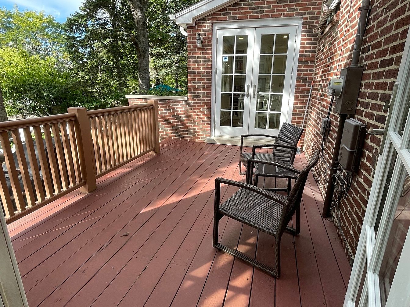A spacious back patio features a warm redwood deck with a stenciled pattern, bordered by a sturdy wooden railing stained to match the floor. Two black wicker chairs and a glass-topped side table create an inviting seating area near the brick exterior wall of the house. French doors with full-length window panes open into the interior, letting in abundant natural light. Mature trees and lush greenery surround the patio, providing a sense of privacy and tranquility. The brickwork of the house and white trim around the doors add a classic and timeless charm to this outdoor living space.