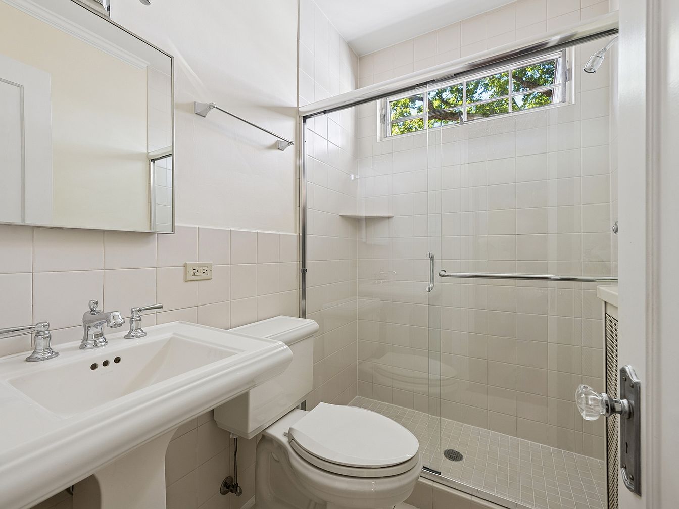 A compact bathroom with a bright and clean feel, featuring soft beige tiles covering the floor and walls. A glass-enclosed walk-in shower occupies the far end of the room, with a transom window above letting in natural light and a view of greenery outside. The space includes a pedestal sink with chrome fixtures, a matching toilet, and a large rectangular mirror above the sink. Subtle details like the simple towel bar, a wall-mounted electrical outlet, and a glass doorknob add a touch of vintage charm, while the overall minimalist design ensures an airy, uncluttered atmosphere.