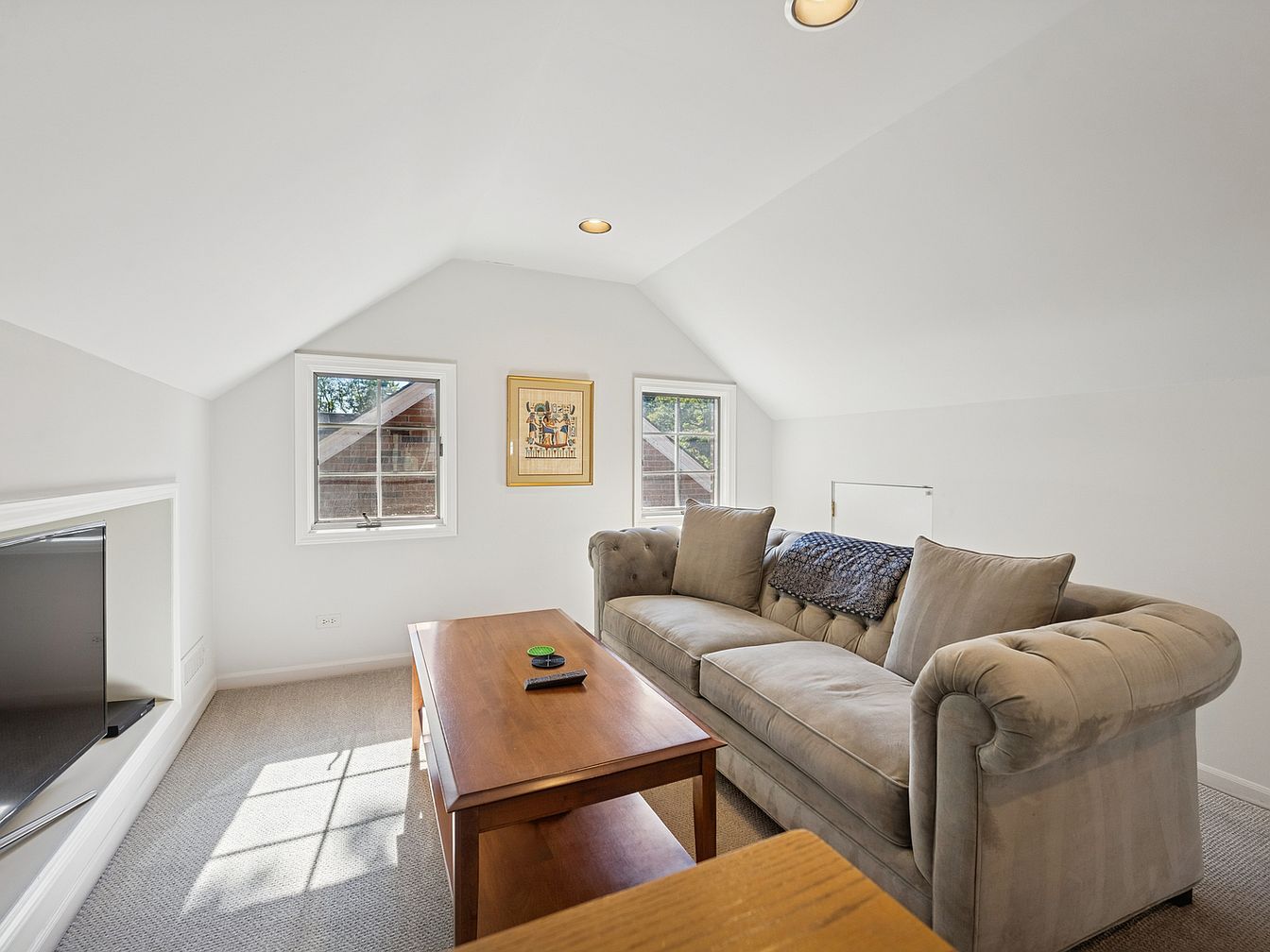A cozy attic living area with sloped white ceilings, soft neutral carpeting, and two small windows that let in natural light. A plush, tufted gray sofa sits against the right wall with a textured throw draped over one arm. In front of the sofa is a simple wooden coffee table with a remote control on its surface. On the left wall, a flat-screen TV is set into a recessed niche. The room features minimalist decor, with a single framed piece of art between the two windows, creating an inviting, tranquil retreat perfect for relaxation or watching television.