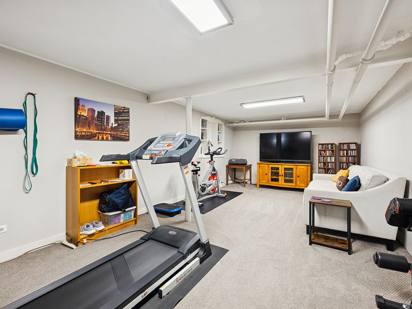 A spacious basement designed for both fitness and relaxation. Neutral-toned carpet covers the floor, and walls are painted in a soft white, creating a bright atmosphere despite the below-ground location. To the left, a treadmill and stationary bike form a small workout zone, complemented by a wooden shelf holding shoes and workout essentials. Overhead, exposed white pipes give an industrial touch. On the far side, a large flat-screen TV rests on a honey-colored wooden console, flanked by shelves of DVDs or CDs. A plush white sectional sofa with accent pillows creates a cozy lounge area, while modern lighting ensures the room feels well-illuminated.
