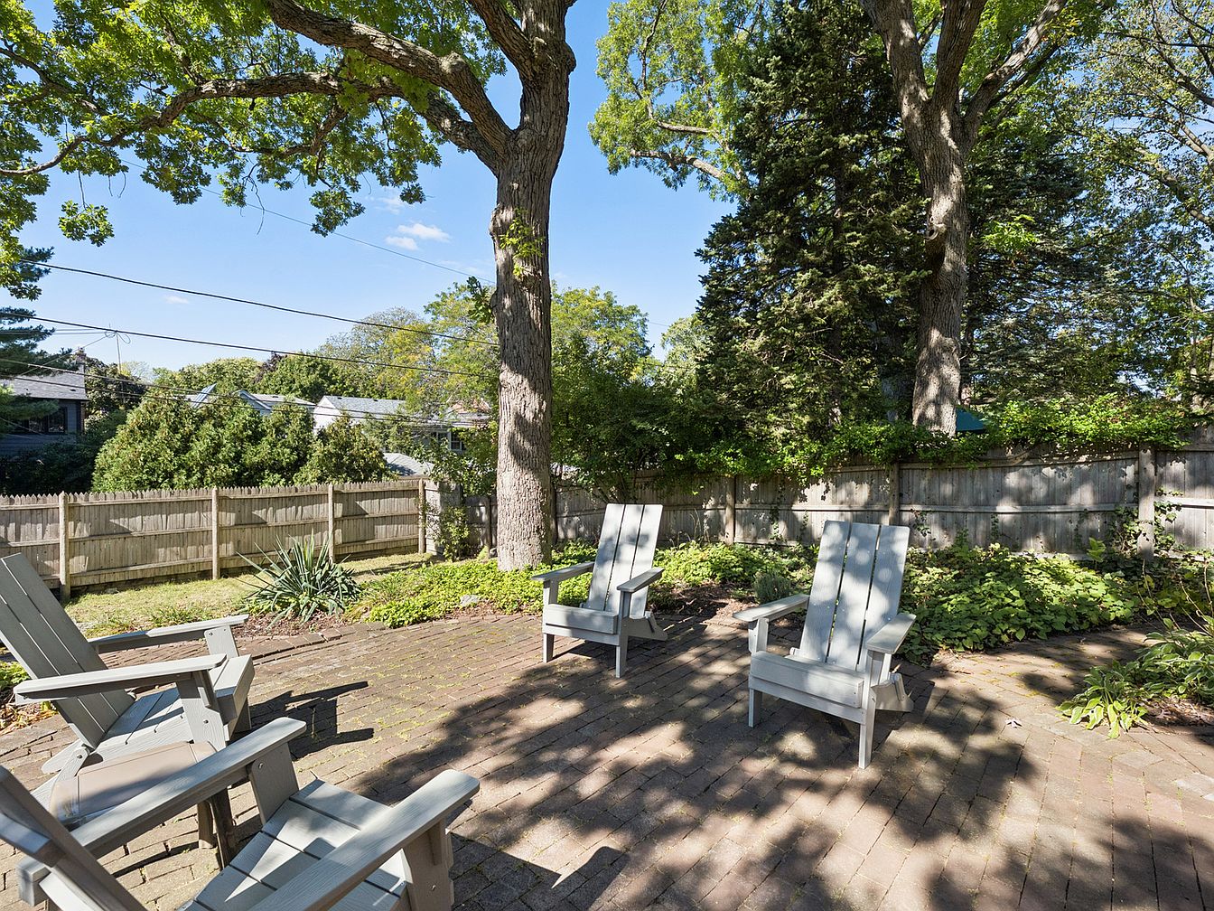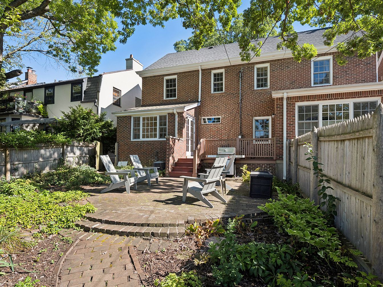 A brick patio extends from the rear of a historic red-brick house, forming a welcoming outdoor gathering space. The patio features several gray Adirondack chairs set around a central fire pit, encouraging socializing and relaxation. Steps lead from a small porch down to the patio, while a wooden fence encloses the area, providing privacy. Lush green shrubs and ground cover line the edges of the patio and fence, bringing a natural, calming atmosphere. Mature trees cast dappled shade over the space, and the house’s traditional multi-pane windows reinforce the classic and timeless aesthetic of the outdoor retreat.