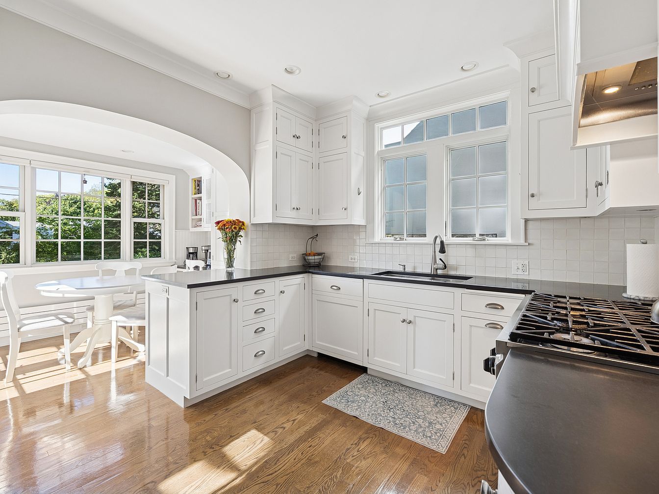 A bright, traditional kitchen features pristine white cabinetry with brushed metal hardware and dark countertops for contrast. Windows above the sink and a large arched window over the breakfast nook flood the space with daylight, highlighting warm, glossy hardwood floors. A white-tiled backsplash complements the neutral walls, while a built-in nook with a round table and matching white chairs creates a cozy dining area. Fresh flowers in a vase and small kitchen appliances add homey touches. Architectural details like deep crown molding and classic recessed panel cabinets evoke timeless elegance, blending with the airy, welcoming vibe.