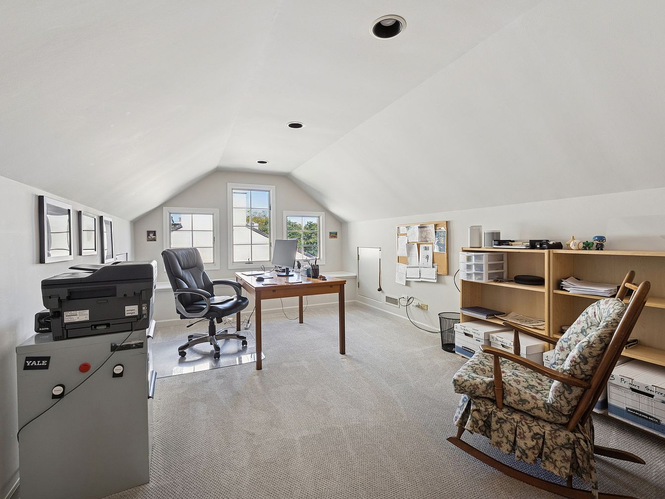 A spacious attic office features a sloping ceiling painted white, which creates a bright, airy atmosphere. Three windows at the far end allow abundant natural light to fill the space. The flooring is covered in light beige carpet, complementing the neutral walls. A wooden desk is positioned facing the windows, accompanied by a black leather swivel chair. To the right, a wooden bookcase holds files and office supplies, with a floral upholstered rocking chair in front. On the left, a gray filing cabinet sits next to a large printer. The aesthetic is functional, organized, and cozy, blending modern office elements with traditional furnishings.