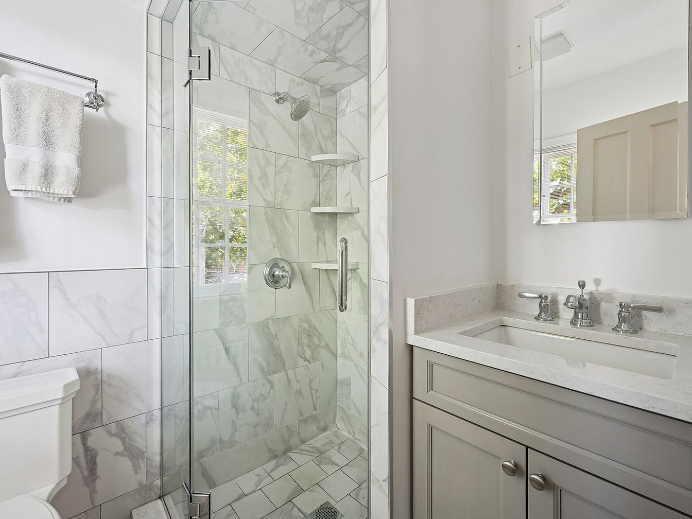 A compact bathroom with a modern, fresh aesthetic and classic design touches. Large rectangular marble tiles in shades of soft gray and white line the shower walls and extend throughout the space, creating a cohesive and elegant look. The glass-enclosed shower features chrome fixtures and small corner shelves, as well as a practical grab bar. Next to the shower is a pale gray vanity with shaker-style cabinet doors, topped by a marble countertop and an undermounted porcelain sink. Above the vanity hangs a frameless mirror, with a chrome faucet and matching hardware tying the room together. A towel bar with crisp white towels and a window provide added brightness and softness.