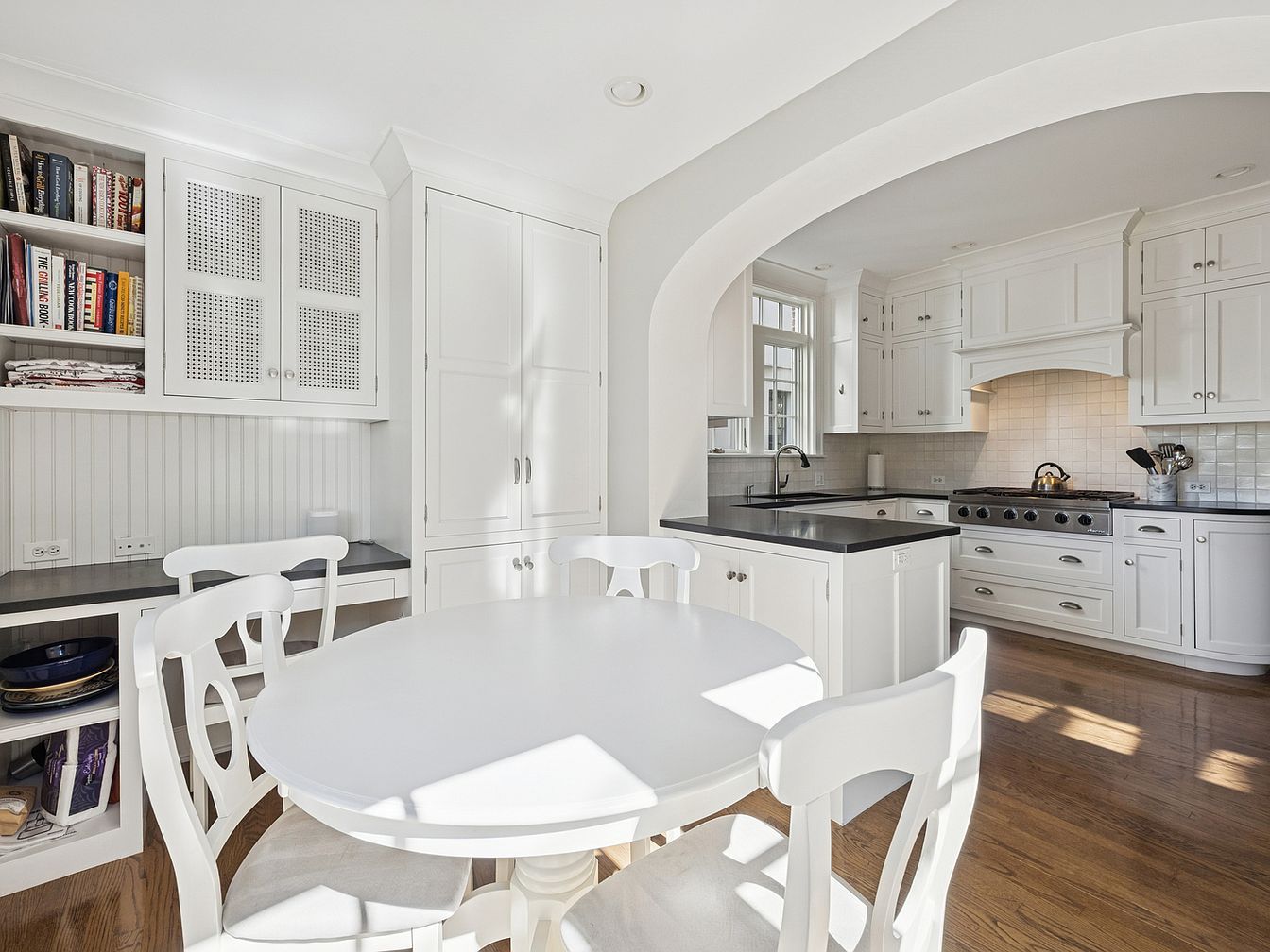 A bright and airy kitchen space with classic white cabinetry and a cozy breakfast nook set against natural light streaming through nearby windows. A round white table with four matching chairs anchors the nook, surrounded by custom built-in shelving, a bookcase, and beadboard paneling. Sleek, dark countertops provide sharp contrast to the cabinetry, while the kitchen features a professional range beneath a decorative vent hood and tile backsplash. Warm wood floors add organic texture and continuity throughout. Subtle crown moldings and gentle curves in the arched doorway offer an elegant architectural touch, blending classic and contemporary aesthetics seamlessly.