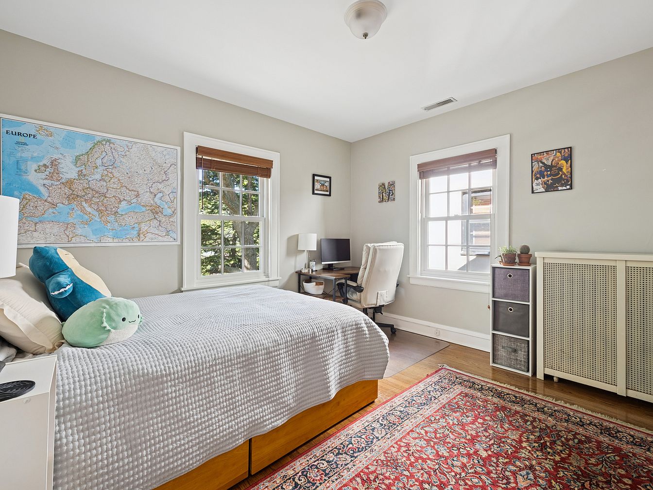 A cozy bedroom filled with natural light from two large, white-trimmed windows, both fitted with simple wooden blinds. The bed features a light gray textured coverlet and whimsical plush pillows, set against soft beige walls. A large map of Europe hangs above the bed. On the right side, a small workspace with an office chair and computer is tucked into the corner beside the window. The floor has a classic, richly patterned red area rug atop warm wood. Decorative items like framed art, small potted plants, and storage cubes provide a personal and inviting touch to the space.