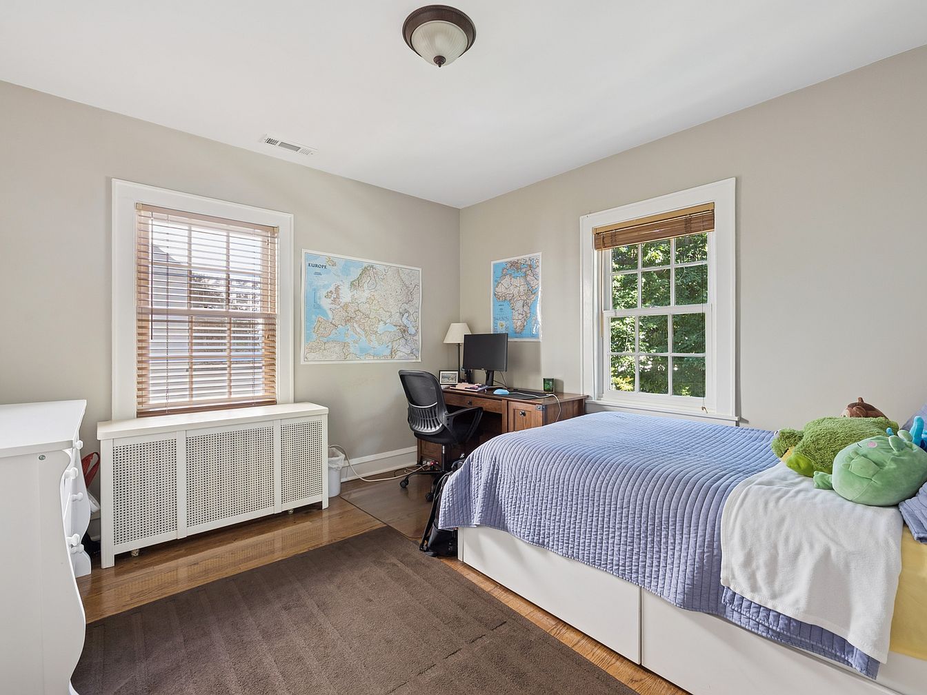 A spacious bedroom with a neutral and calming color palette, featuring light beige walls and white trim around large windows that fill the space with natural light. One side of the room offers a cozy platform bed dressed in a light blue quilt, accented with playful green plush toys. Across from the bed is a dark wooden study desk with a black ergonomic office chair, computer, and desk lamp, suggesting a dedicated workspace. Two large maps are mounted on the walls above the desk, while wood blinds and a brown area rug contribute to the warm, inviting aesthetic. The room feels organized and airy.