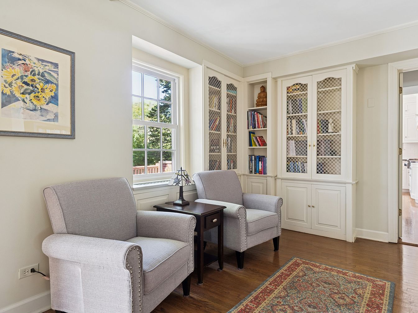 A cozy corner of the house featuring two soft gray upholstered armchairs with button detailing, positioned side by side around a dark wood side table topped with a small decorative lamp. Natural light streams in from a large, multi-paned window framed by cream trim, giving the space a bright and inviting atmosphere. Built-in white cabinetry with mesh-front doors and shelves holds books and small decorative items, enhancing the classic, historic ambiance. The neutral wall color pairs with warm wood flooring, partially covered by a Persian-style area rug in soft red and blue tones. A framed floral watercolor print hangs on the wall, adding a soft artistic touch.