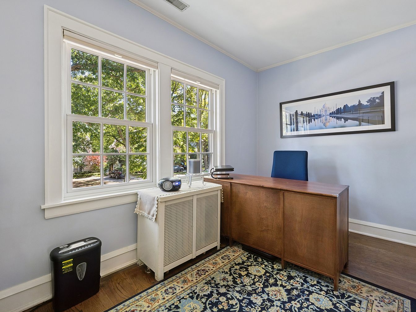 A bright and inviting corner of a home office features large white-trimmed windows that let in ample natural light and offer views of leafy green trees outside. The walls are painted a soft, calming blue, which pairs well with the rich, dark hardwood floors. A vintage-style wooden desk sits against the wall, paired with a deep blue upholstered chair. A patterned carpet with navy, cream, and gold tones covers part of the floor, adding warmth and visual interest. Minimal décor includes a panoramic framed print with serene waterscape imagery, a small radio, and a paper shredder in one corner.