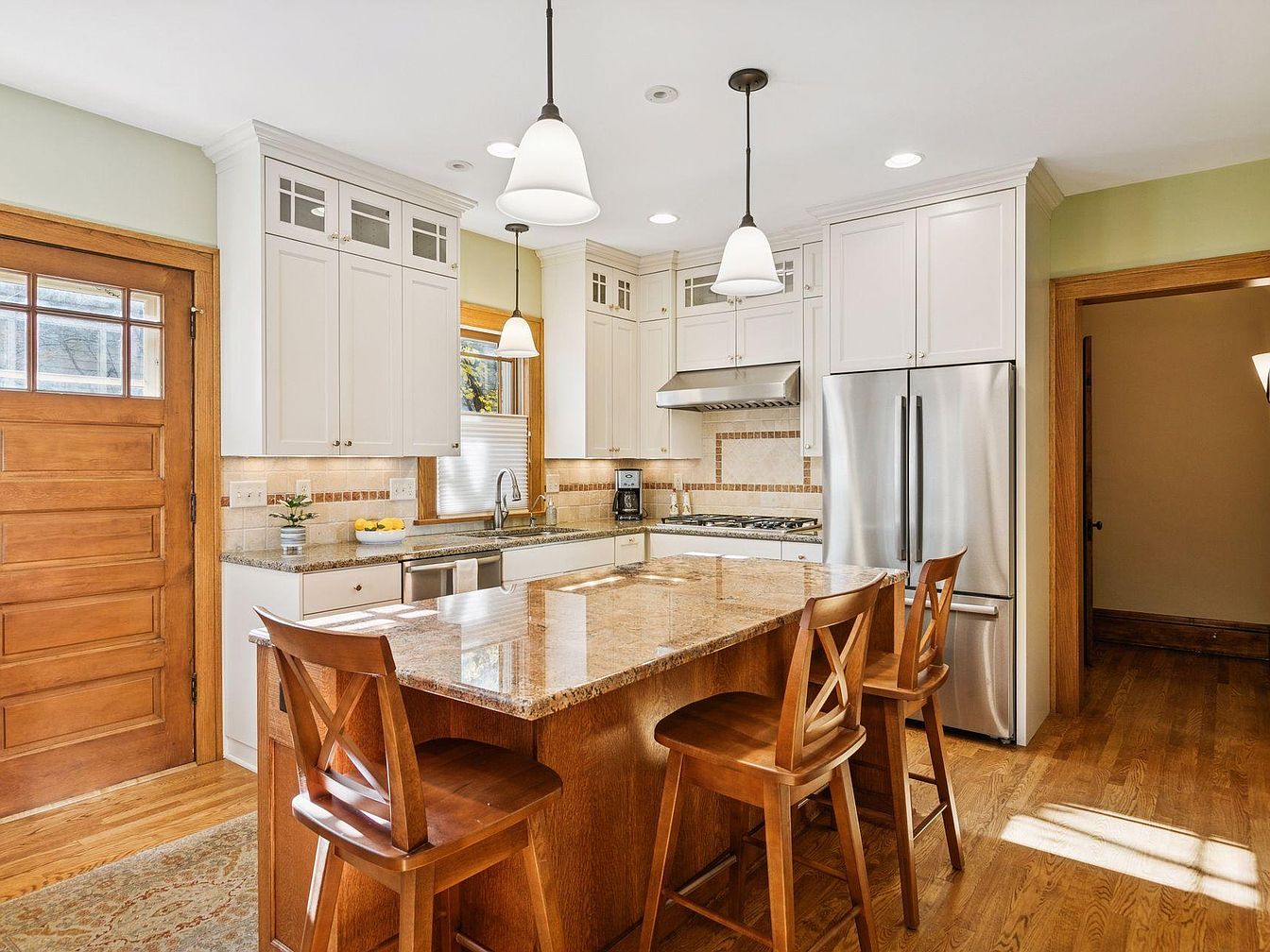 Warm wood tones and crisp white cabinetry dominate the kitchen, creating a welcoming and timeless feel. The island features a polished granite countertop with space for three wooden chairs, combining functionality with comfort. Stainless steel appliances, including a large refrigerator and range hood, add a modern touch to the traditional design. A large wooden door and matching trim frame the space, while pendant lighting and recessed ceiling lights provide bright, even illumination. Light sage green walls and a neutral area rug complete the inviting atmosphere, balancing vintage architectural charm with updated practicality.