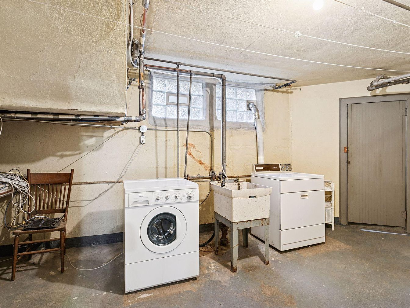 A utilitarian basement space with concrete floors and cream-colored plaster walls, showing signs of age and visible cracks. The area contains a basic washing machine, a dryer, and a deep-set utility sink standing on sturdy metal legs, all positioned under a glass block window that brings in soft, diffused light. Exposed pipes run along the ceiling and upper wall, contributing to the unfinished, industrial atmosphere. A wooden chair sits against the wall, holding a tangle of cords, while a simple, solid door is located near the corner, painted in muted taupe. The overall ambiance feels practical and functional, with retro and worn details.