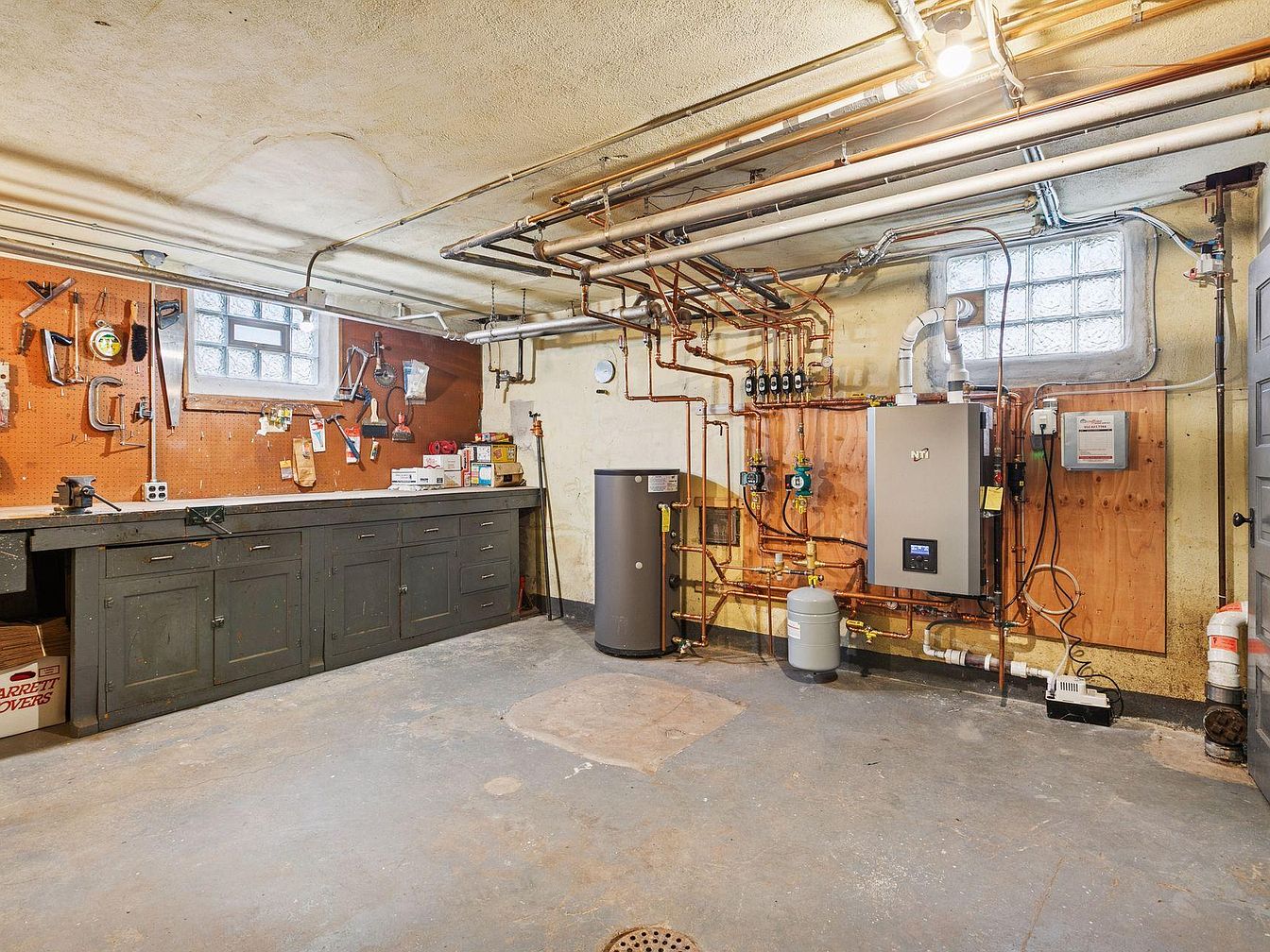 A functional basement space features a long, dark workbench with several lower cabinets and drawers, spanning the left wall beneath a small glass block window. A pegboard above the workbench holds an assortment of well-used hand tools, brushes, and garden implements, adding a practical, utilitarian charm. The walls are yellowed and worn, emphasizing the historic character of the home. Numerous exposed copper pipes, a tank, and a modern boiler system are neatly organized along the far wall, blending old-world construction with updated mechanicals. The floor is rough concrete, creating a rugged, authentic work environment filled with purposeful details.