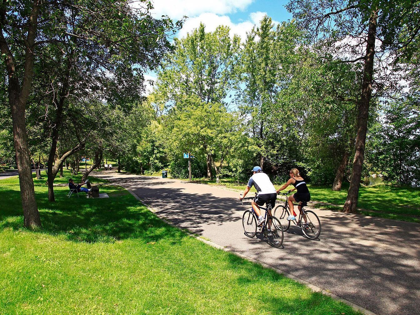 A paved pathway curves gently through a verdant garden lined with mature trees and lush green grass. Sunlight filters through the foliage, casting dappled shadows onto the trail and the grassy lawn. Two cyclists ride side by side along the path, dressed in comfortable activewear, suggesting a leisurely, recreational ambiance. To the left, a couple of people sit together on a bench nestled under shade, adding to the tranquil, inviting atmosphere. The colors are vibrant with bright blue sky peeking through tall, dense trees, creating a refreshing outdoor retreat ideal for relaxation and exercise.