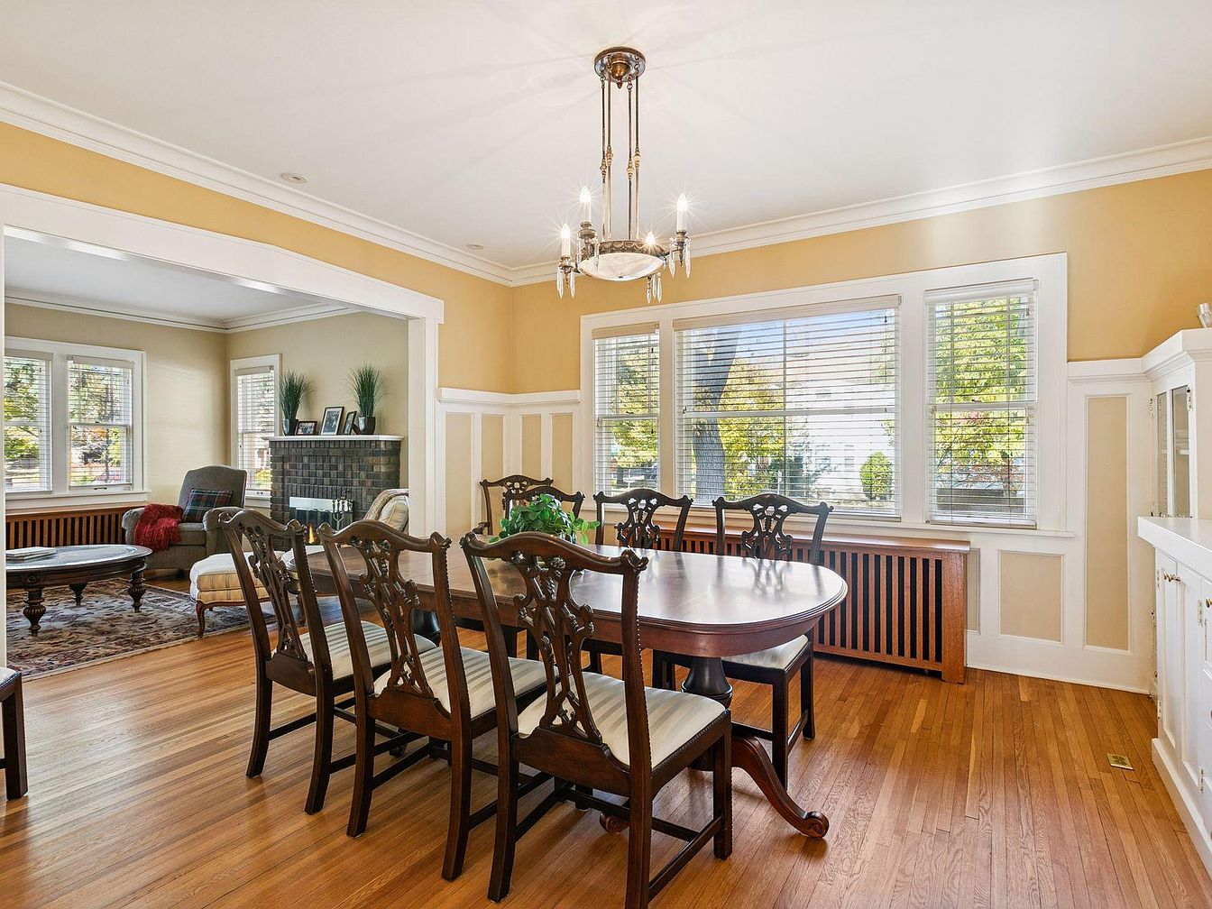 A spacious dining room with warm, honey-toned walls and crisp white wainscoting along the lower half contributes to an inviting, classic atmosphere. A large wooden dining table with six ornately carved chairs takes center stage on glossy hardwood floors. Tall windows with white trim allow abundant daylight to fill the space and offer views of leafy trees outside. A statement chandelier hangs above the table, adding an elegant touch. To the side, built-in cabinetry provides display and storage. An open archway leads into a cozy living area with a fireplace, armchairs, and additional windows, tying the rooms together with a sense of historic charm.