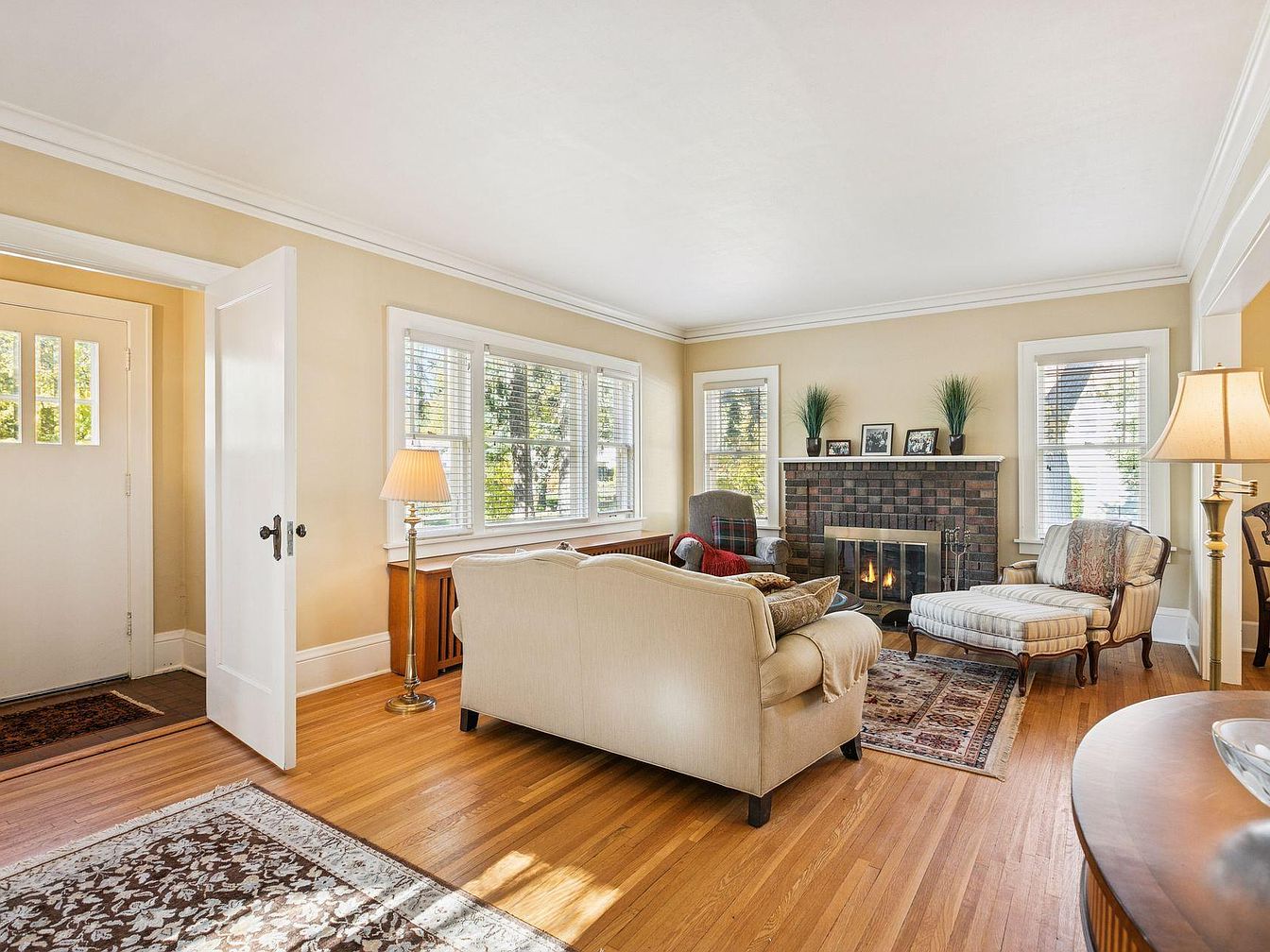 A sunlit living room features a soft neutral color palette with buttery yellow walls and crisp white crown molding. Wide windows allow natural light to flood the space, enhancing the inviting atmosphere. At the center, a beige upholstered sofa faces a dark brick fireplace with a brass screen, topped with framed photos and greenery. To the right, a striped chaise lounge pairs with a plush armchair, both adding traditional charm. Hardwood floors and layered area rugs contribute warmth and texture. Tall lamps at the corners provide ambient lighting, while delicate furnishings and classic details convey timeless elegance.