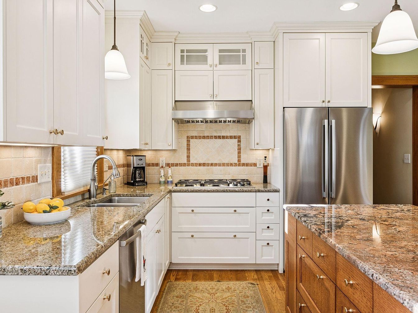 A bright, welcoming kitchen with a U-shaped layout features sleek white cabinetry accented by brushed nickel hardware. Warm, speckled granite countertops line the perimeter and a matching, expansive island with wooden base takes center stage. Stainless steel appliances, including a double-door refrigerator and built-in oven, add a modern touch. The sink area is set beneath a window framed in wood, and a bowl of lemons adds a pop of color. Neutral-toned, patterned backsplash tiles with a brick-red border and a decorative inset above the stove provide subtle visual interest. Pendant lighting and under-cabinet lights ensure an inviting, well-illuminated workspace.