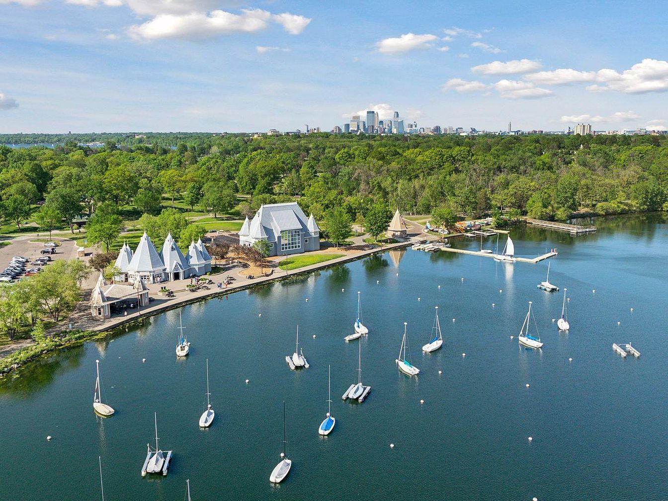 A peaceful lakeside scene with numerous sailboats moored in calm blue water, bordered by lush trees and expansive greenery. Onshore, several buildings with steeply pitched gray roofs and pointed gables are nestled among mature trees, likely historic in design, creating a quaint, village-like feel. The area is lively, with people walking along the paved paths and congregating near the water’s edge. In the background, the greenery stretches out towards a modern city skyline under a bright, clear sky. The overall impression is one of serene natural beauty combined with picturesque community architecture.