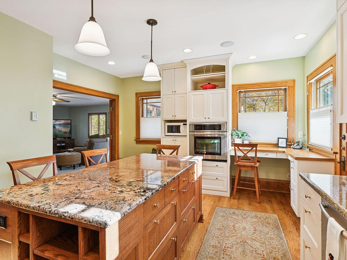 A spacious kitchen with soft green walls and warm wood trim, featuring a large granite-topped island at the center surrounded by wooden chairs with X-back designs. Natural light streams in from multiple windows, highlighting the golden wood floors and white cabinetry. The kitchen includes a built-in oven and microwave, along with a desk nook under corner windows with wooden trim and blinds, providing a cozy workspace. Pendant lights hang above the island, casting a soft glow. The open layout connects to a living area, glimpsed through a wide doorway, and the rug adds warmth and texture to the inviting space.