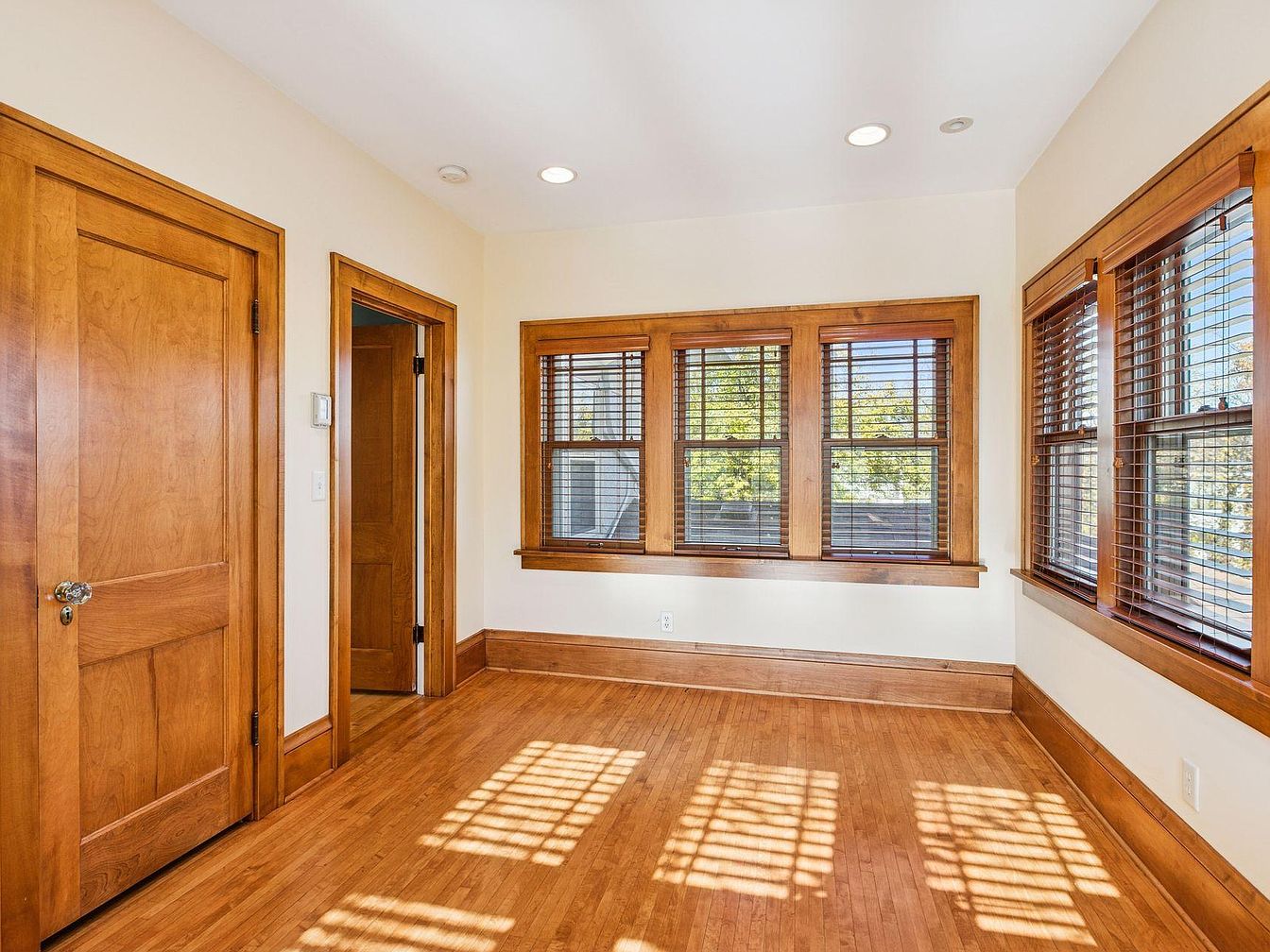 A bright, inviting corner room features honey-toned wood trim, baseboards, and window frames that add warmth to the space. The floor is crafted from matching hardwood, contributing to a cohesive look with the large wooden doors and trim along the walls. Three large multi-pane windows on two sides fill the room with natural light, casting patterned shadows onto the floor. Rich wood blinds offer privacy while letting in sunlight. Creamy off-white walls enhance the airy, sun-filled atmosphere. The room feels open and classic, blending timeless millwork with elegant simplicity, perfect for relaxing or reading.