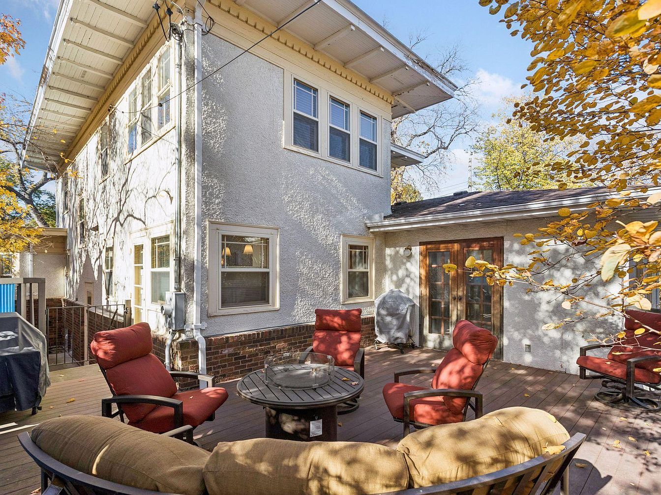 A cozy outdoor wooden deck is nestled beside a historic stucco and brick home, surrounded by autumn foliage. The patio is arranged with four comfortable armchairs in deep red upholstery and a curved beige cushioned sofa, all centered around a round fire pit table. French doors with wood frames open from the house onto the deck, while a barbecue grill sits nearby. Sunlight filters through golden leaves, casting dappled shadows over the neutral-toned stucco walls and windows with white trim. The overall atmosphere is inviting and relaxed, perfect for gatherings or enjoying the crisp outdoor air.