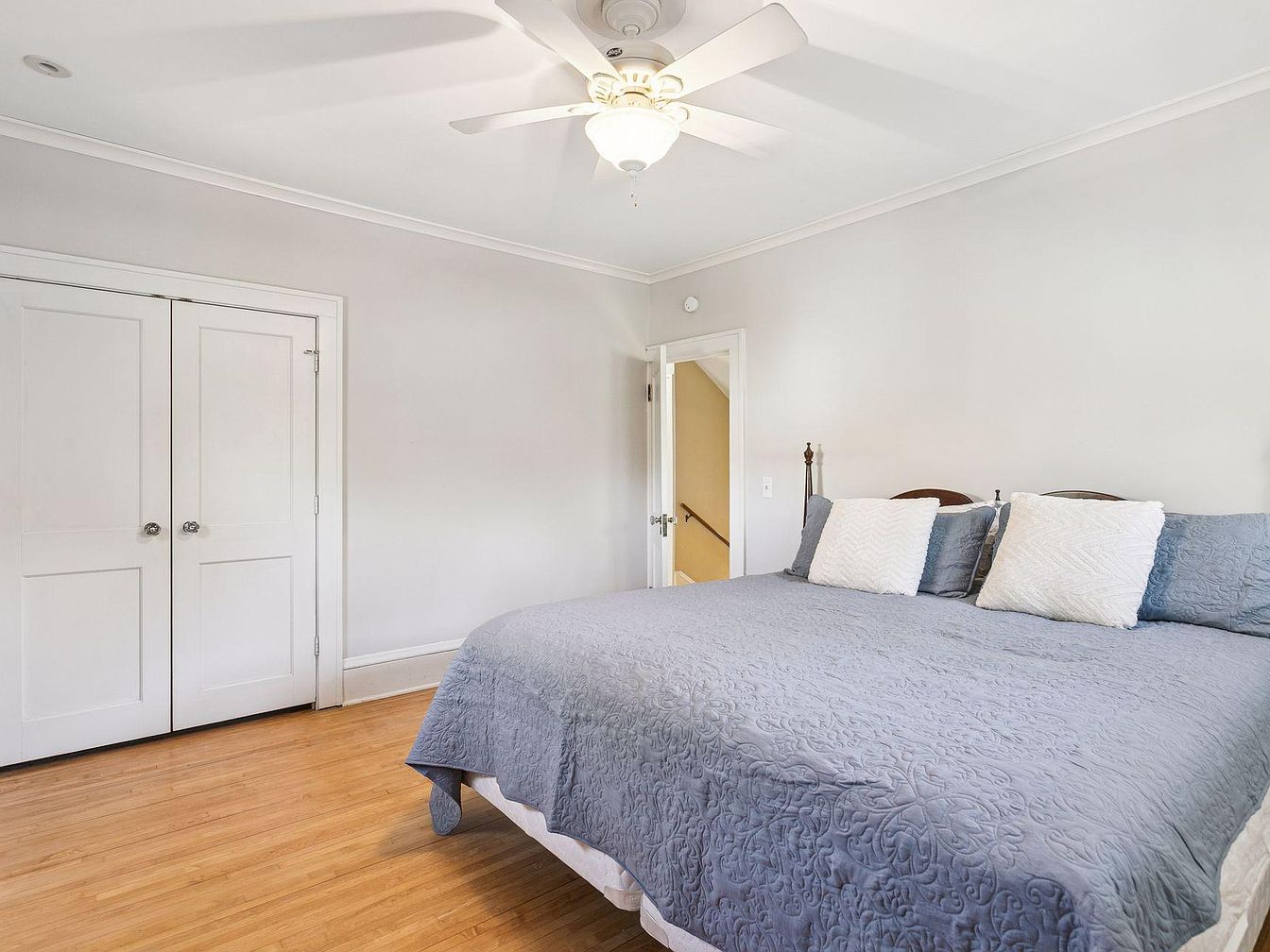 Spacious bedroom featuring light wooden floors and soft gray walls creating an airy, tranquil ambiance. A large bed with an ornate, subtle-patterned gray comforter and four pillows—two white and two matching the bedding—sits to the right. The ceiling fan with a central light fixture provides both illumination and a classic touch overhead. Double white panel closet doors with chrome knobs are on the left wall, while an open doorway reveals a glimpse of a warmly lit hallway. Crown molding and baseboards accent the classic, understated style of the room, contributing to its inviting, restful atmosphere.
