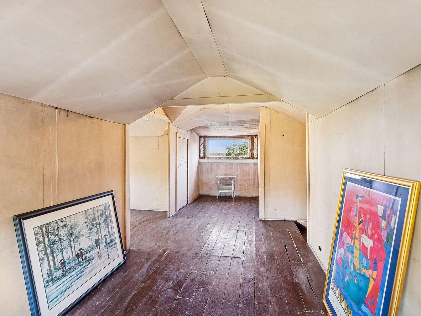 A narrow, elongated attic space with angled low ceilings and unfinished pale wooden walls, creating a rustic and raw feel. The dark, weathered hardwood floorboards run the length of the room, adding visual warmth and texture. Two colorful framed artworks rest against the left and right walls, featuring a serene forest scene and a vibrant abstract painting, providing a pop of color and an element of personal character. At the far end, a small window lets in natural light, with a simple wooden stool beneath it. The overall aesthetic is unembellished and humble, with a sense of vintage authenticity.